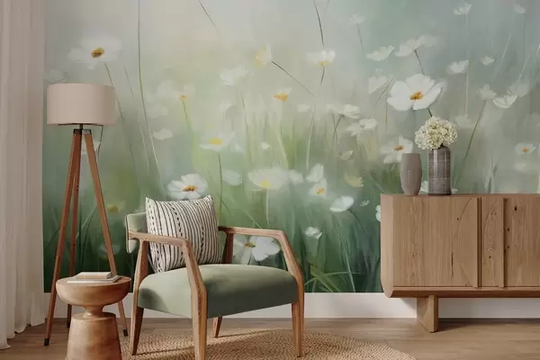 Fotomurales Campo abstracto de margaritas blancas con hierba verde y un fondo suave y difuso en estilo pictórico. Nr. w09619