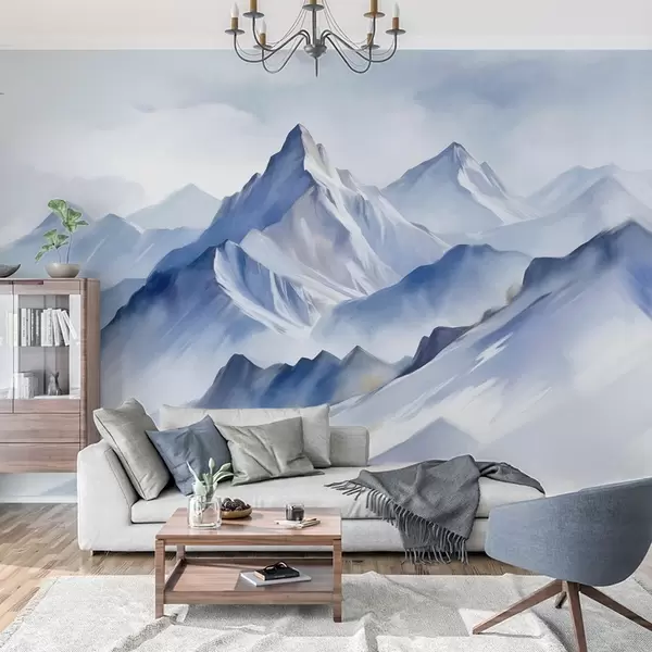 Fotomurales Montañas nevadas con textura, un suave efecto acuarela y una paleta de colores azul y blanco. Nr. w09630