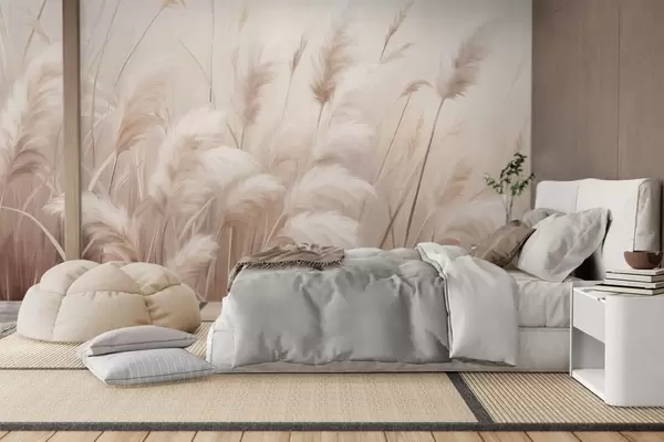 Fotomurales Hierba de la pampa alta y texturizada en tonos suaves, cálidos y neutros, con un fondo difuminado y claro. Nr. w09637