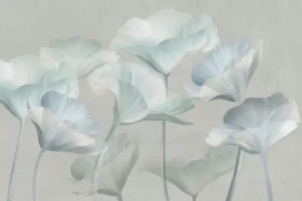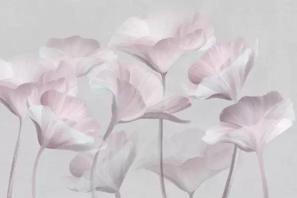 Fotomurales Flores de loto translúcidas con textura de melocotón pálido y delicados pétalos sobre un fondo gris apagado. Nr. w09640