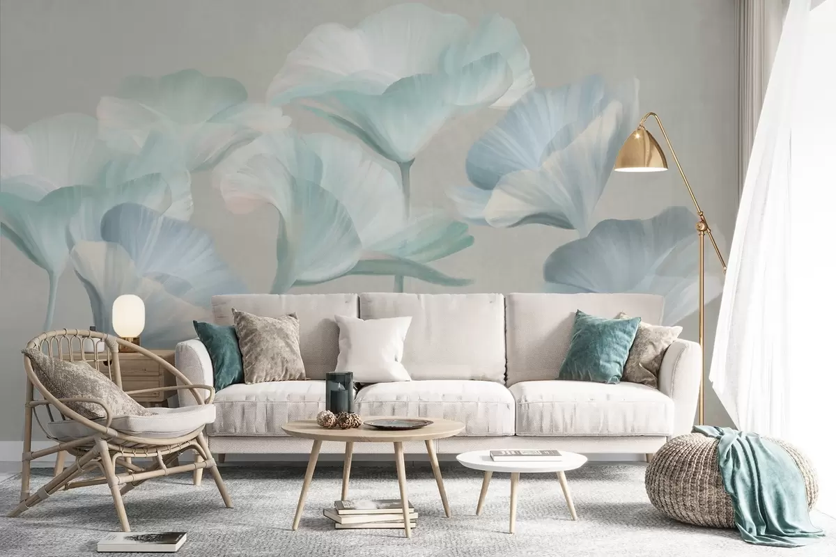 Fotomurales Flores de loto translúcidas de color turquesa pálido con pétalos delicados sobre un fondo gris apagado. Nr. w09640v2