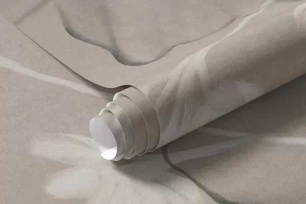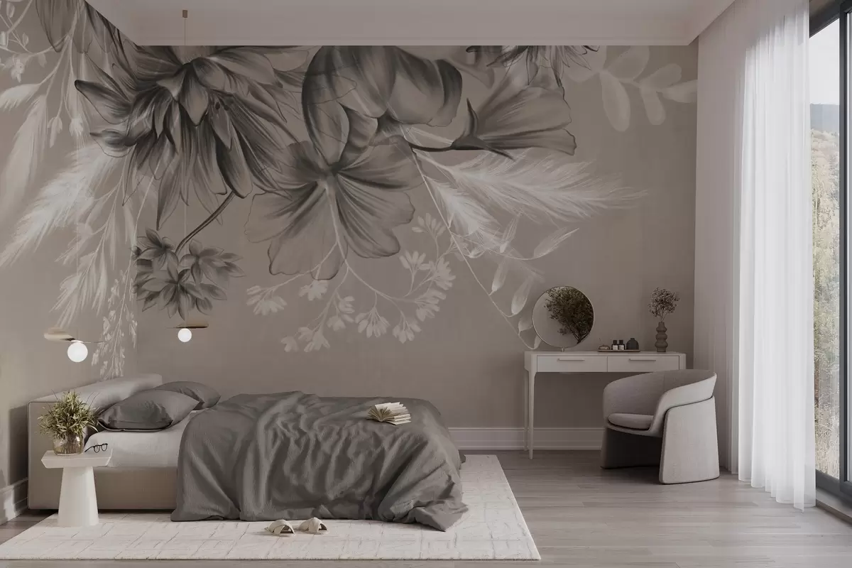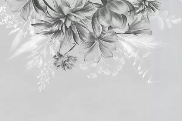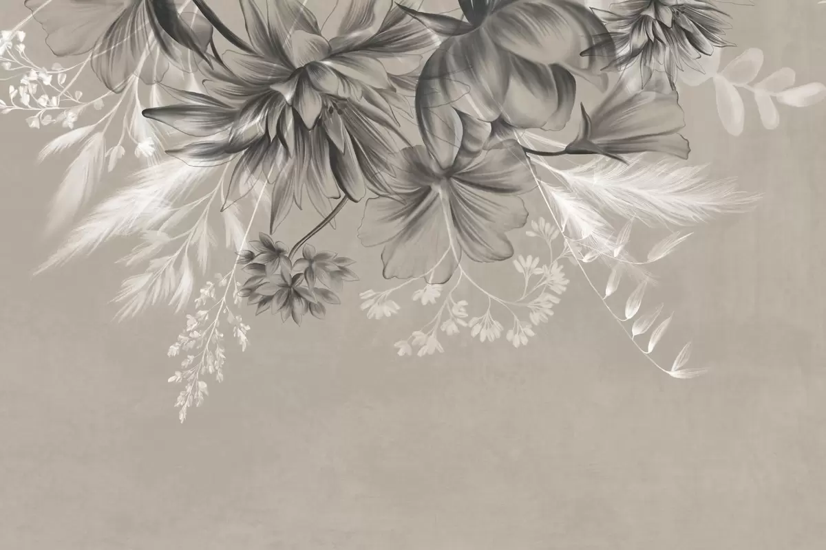 Fotomurales Flores y helechos texturizados en tonos gris oscuro y blanco sobre un fondo beige apagado, estilo de dibujo. Nr. w09644