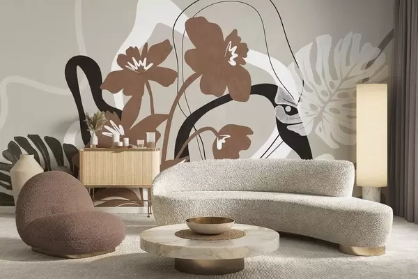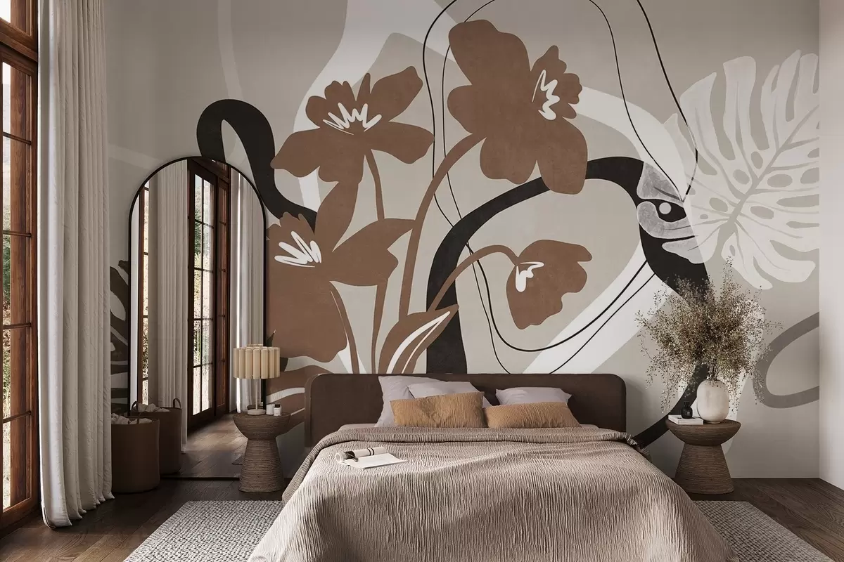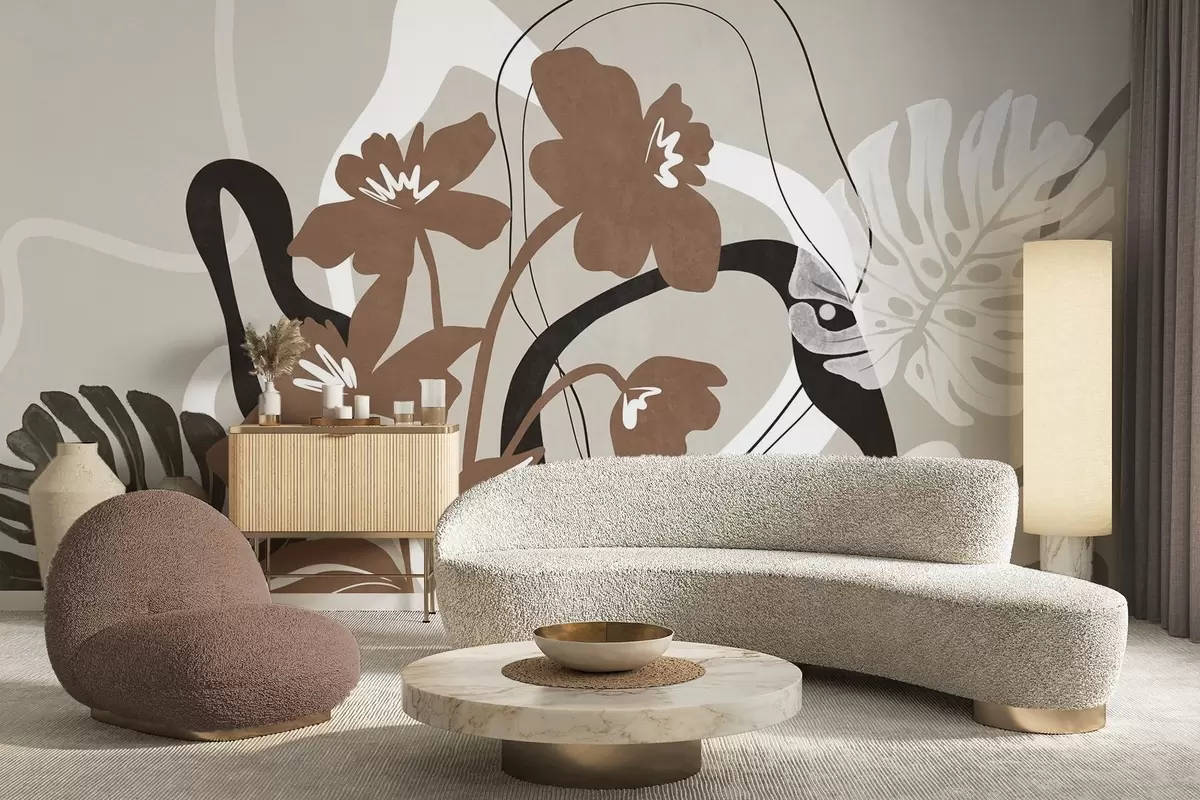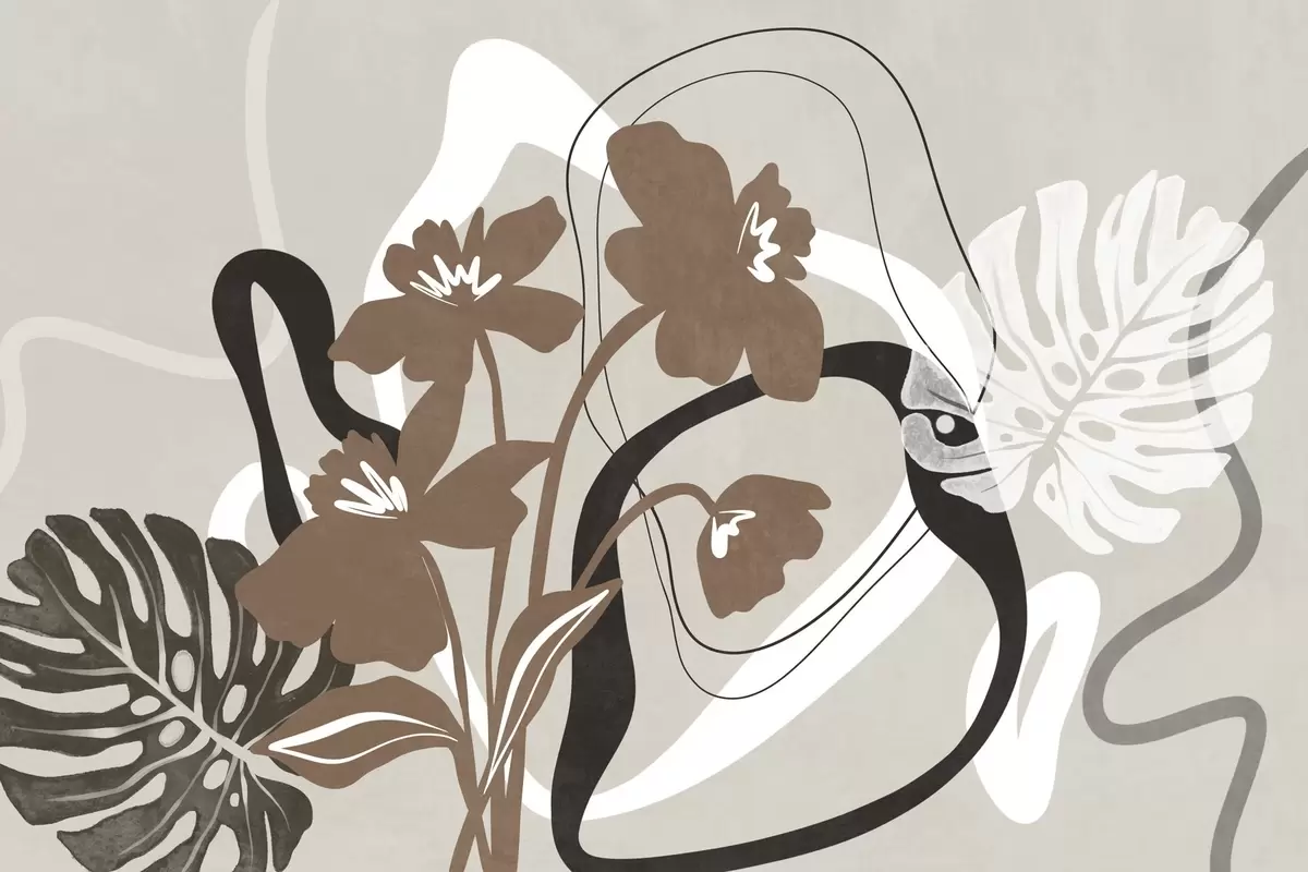 Fotomurales Flores marrones abstractas con textura y formas blancas y negras sobre fondo beige, arte minimalista. Nr. w09645v1