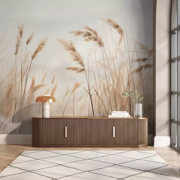 Fotomurales Hierba seca alta y texturizada con espigas de trigo en el campo sobre un fondo suave y pálido. Nr. w09648