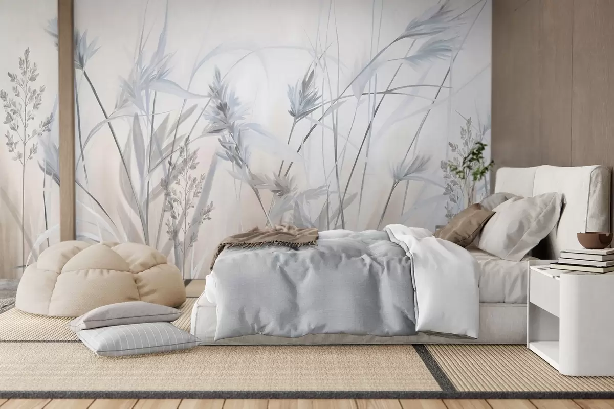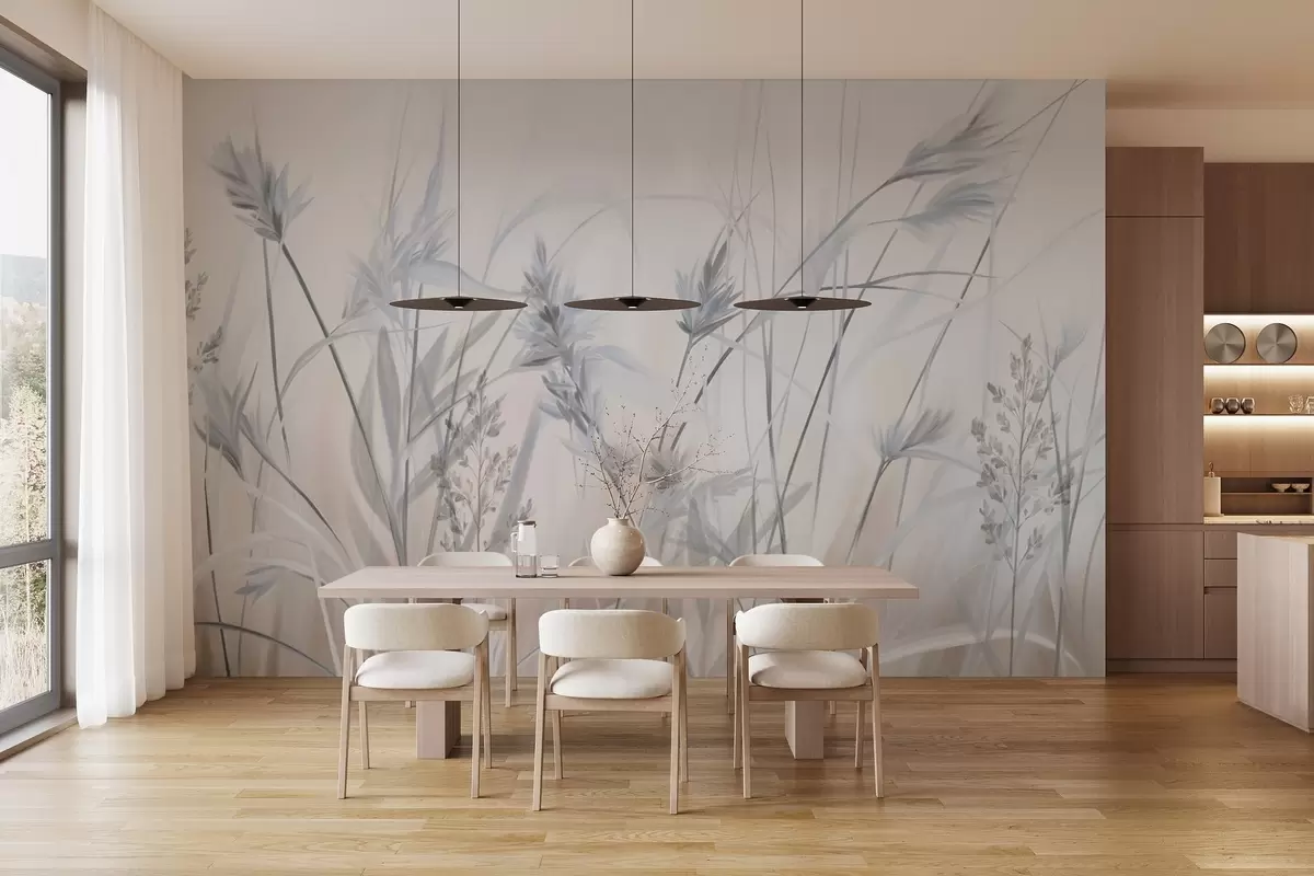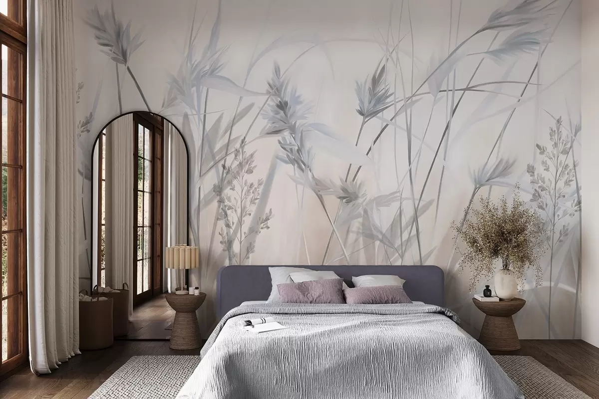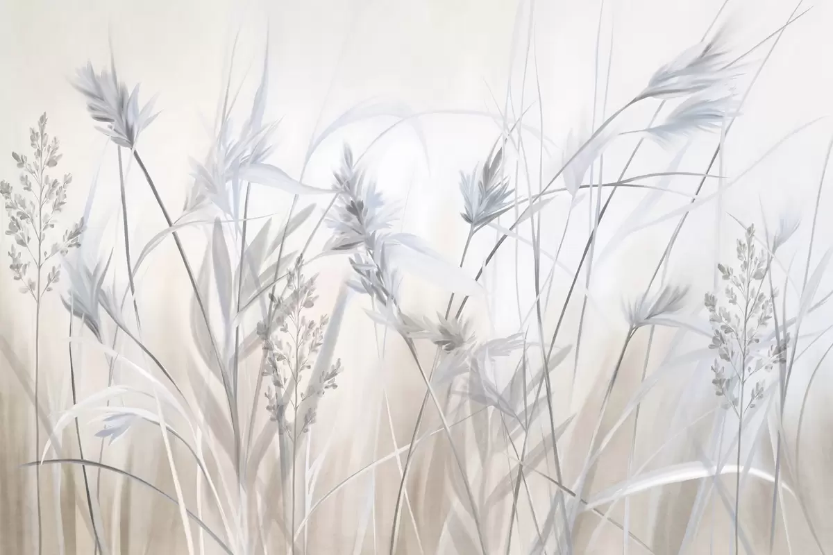 Fotomurales Tallos altos y secos de hierba con puntas plumosas en tonos apagados, fondo blanco y beige suave y difuminado. Nr. w09652v1