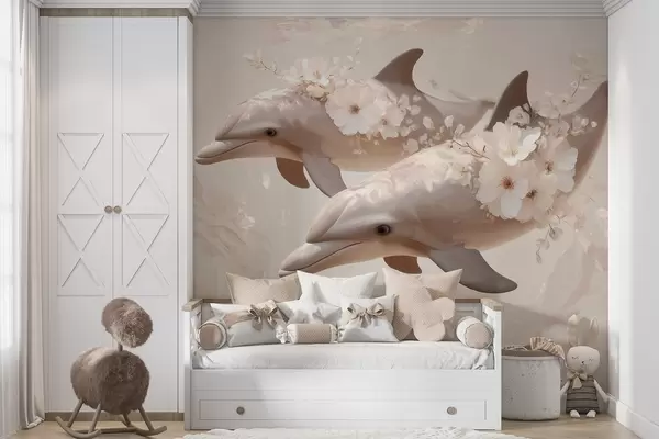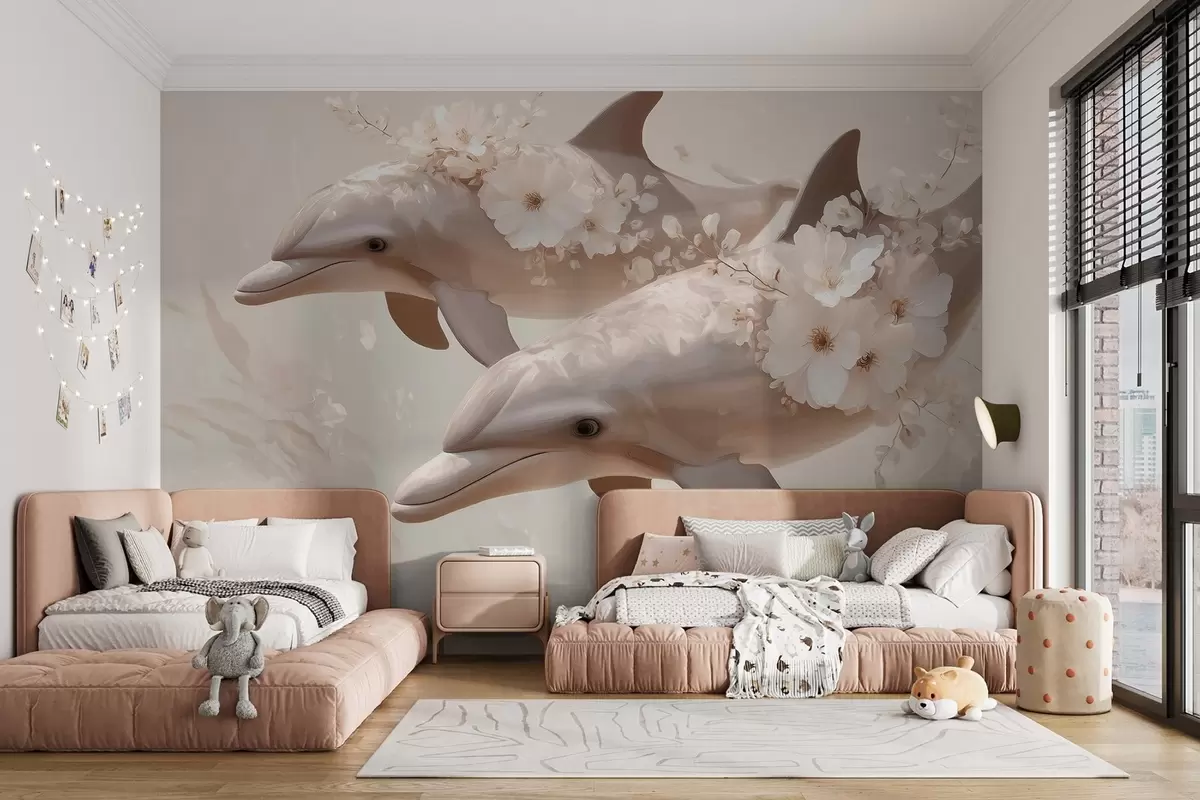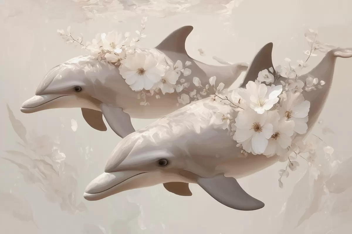 Fotomurales Delfines en un océano de flores delicadas y luz tenue Nr. w09666