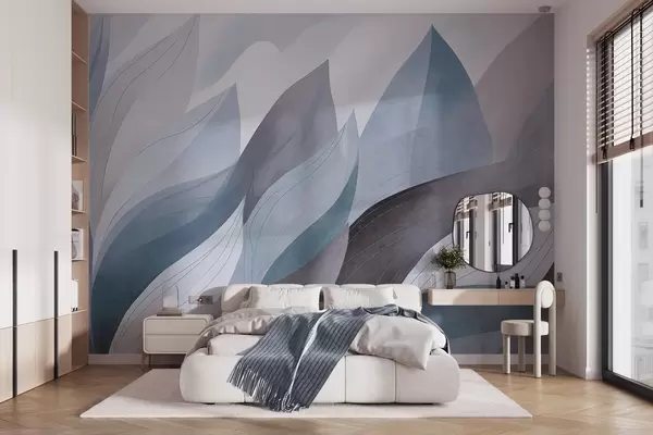 Fotomurales Hojas abstractas, tonos tierra apagados en azul con delicados detalles lineales, textura suave de acuarela. Nr. w09736v1