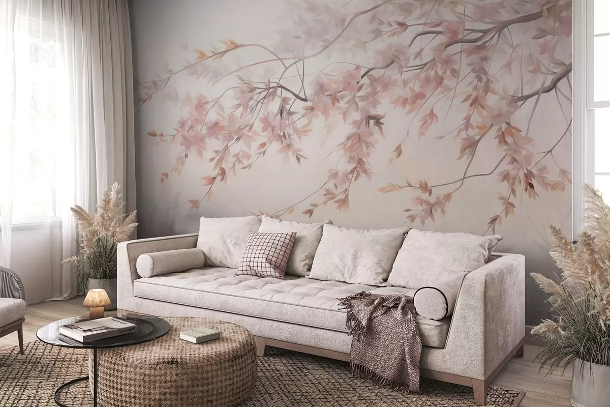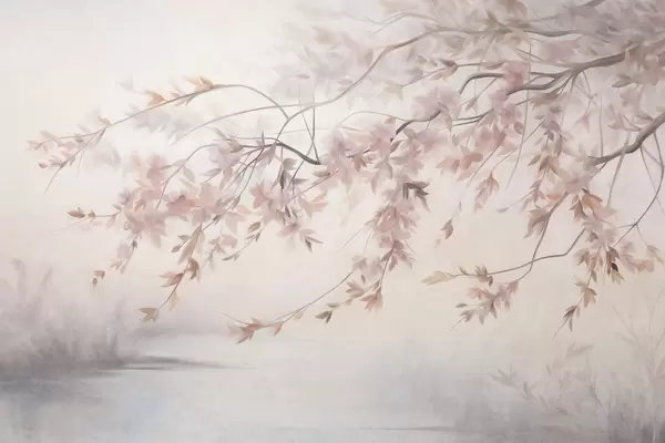 Fotomurales Paisaje texturizado con rama de cerezo en flor, hojas rosadas y fondo suave y brumoso. Nr. w09743