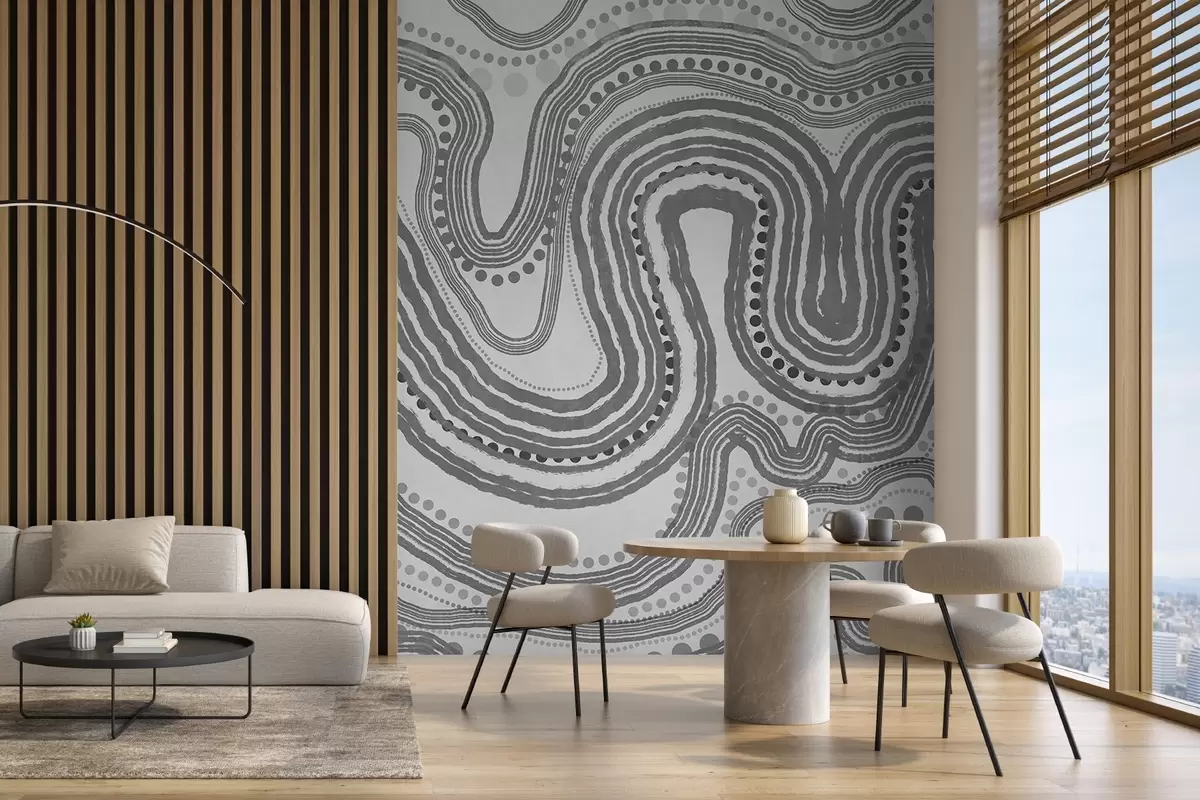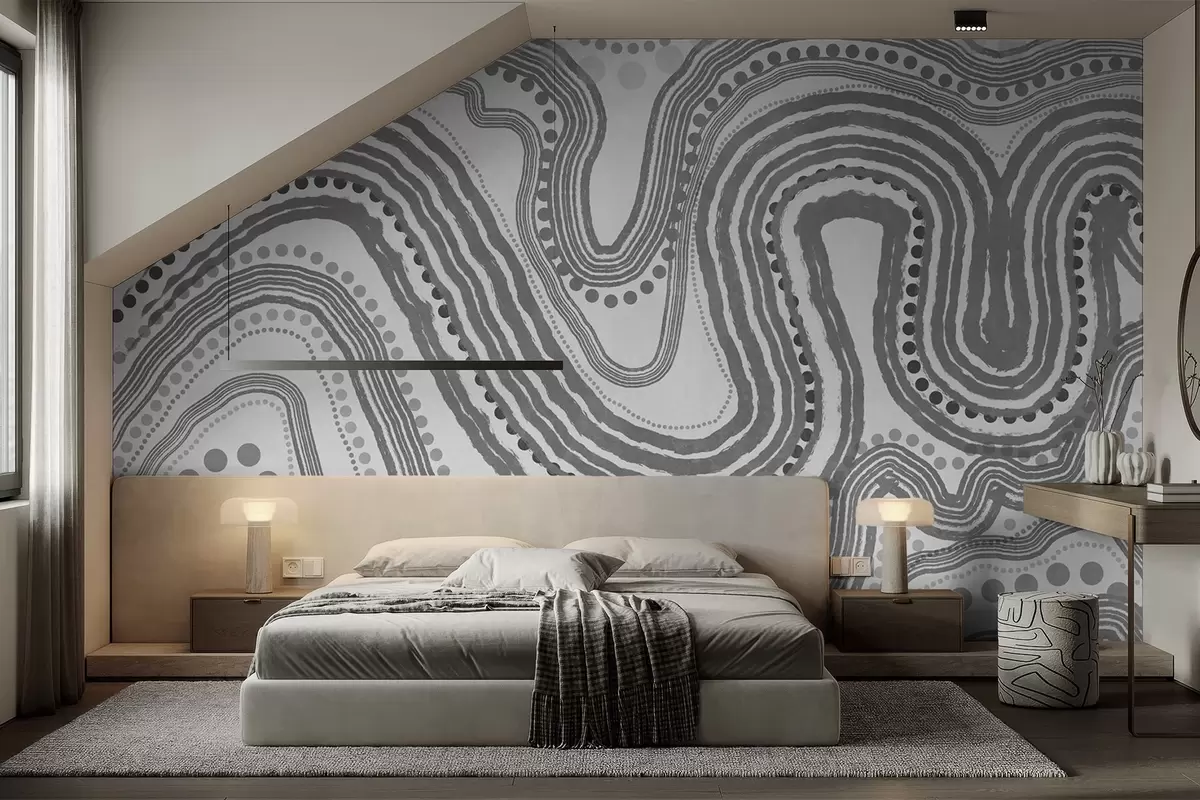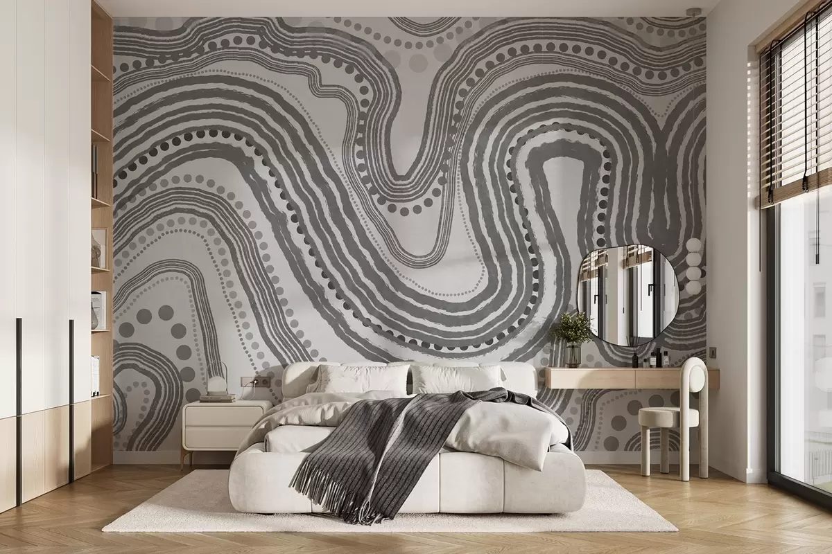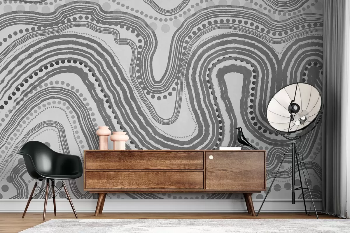 Fotomurales Líneas onduladas y puntos abstractos en gris oscuro, arte moderno con textura. Nr. w09747v2