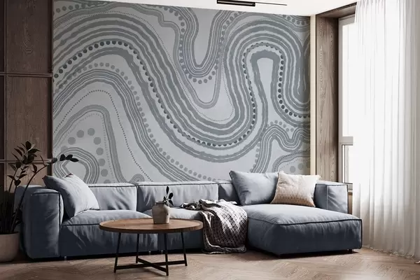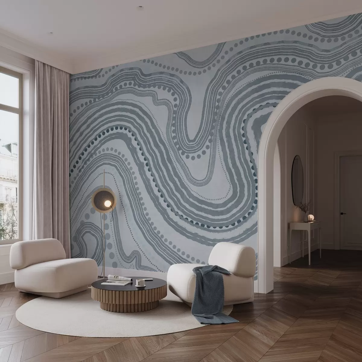 Fotomurales Líneas onduladas y puntos azules abstractos, arte moderno con textura. Nr. w09747v3