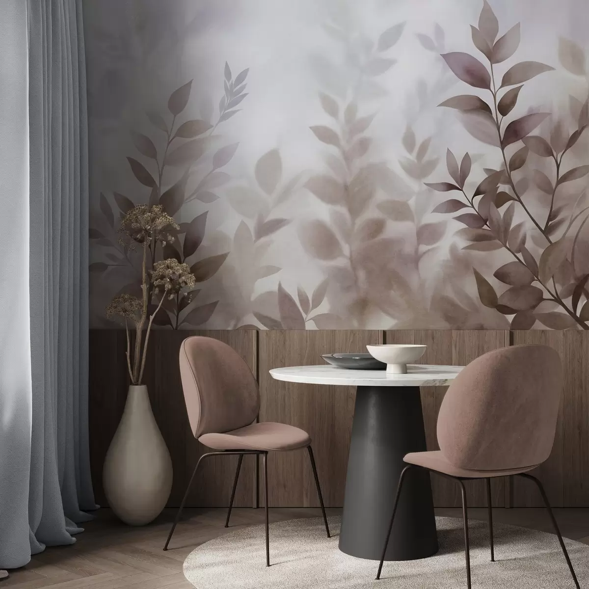 Fotomurales Ramas delicadas con hojas de tonos marrones y beiges apagados, estilo acuarela, arte con textura. Nr. w09750