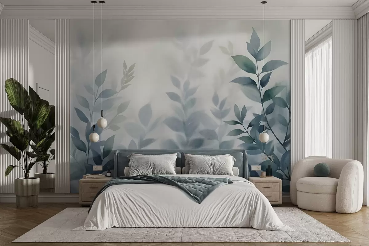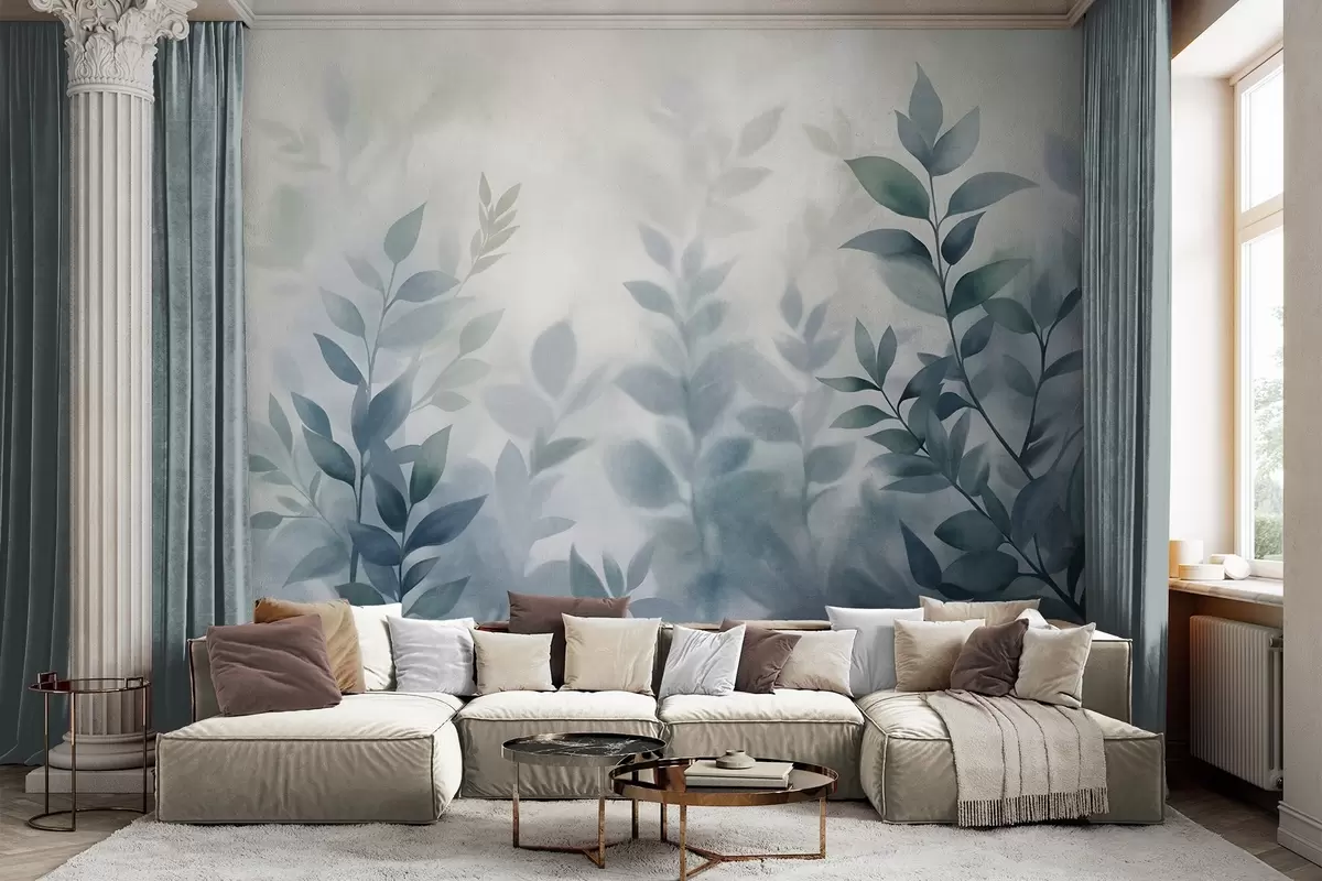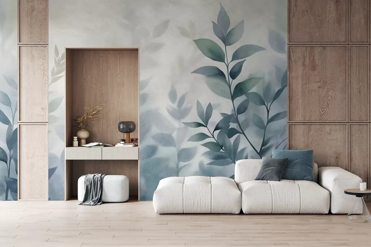 Fotomurales Ramas delicadas con hojas de color azul apagado, estilo de pintura acuarela, arte con textura. Nr. w09750v1