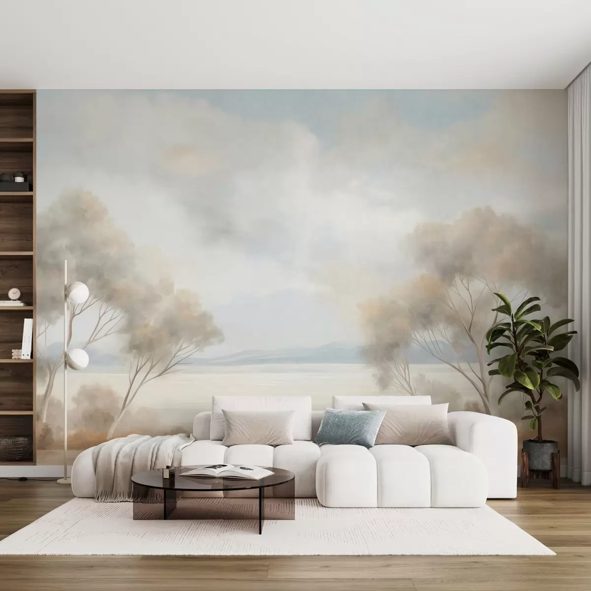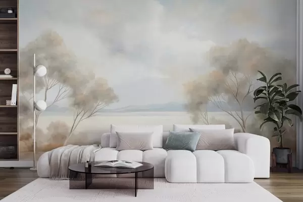 Fotomurales Un estilo de pintura con textura paisajística con árboles bajo un cielo nublado. Nr. w09753