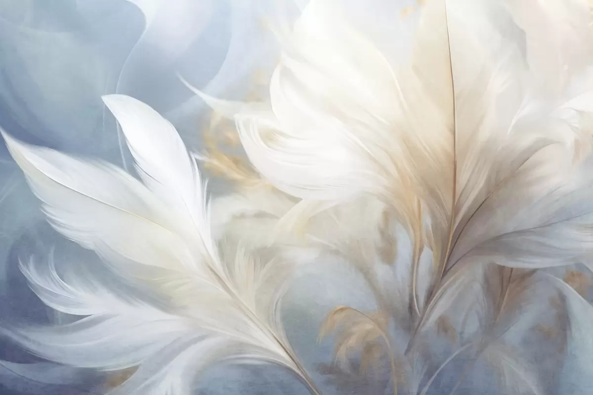 Fotomurales Plumas blancas suaves y texturizadas y hierba de la pampa difuminada con fondo azul y blanco. Nr. w09758