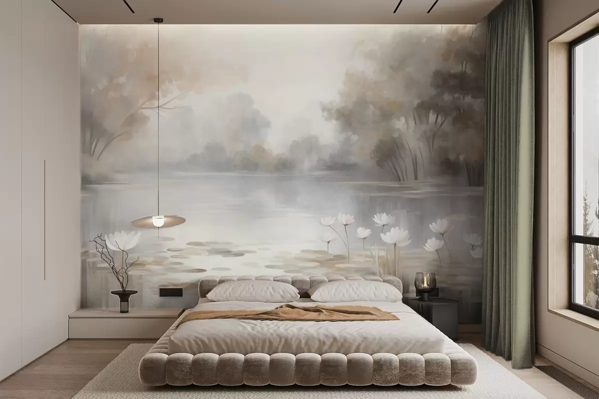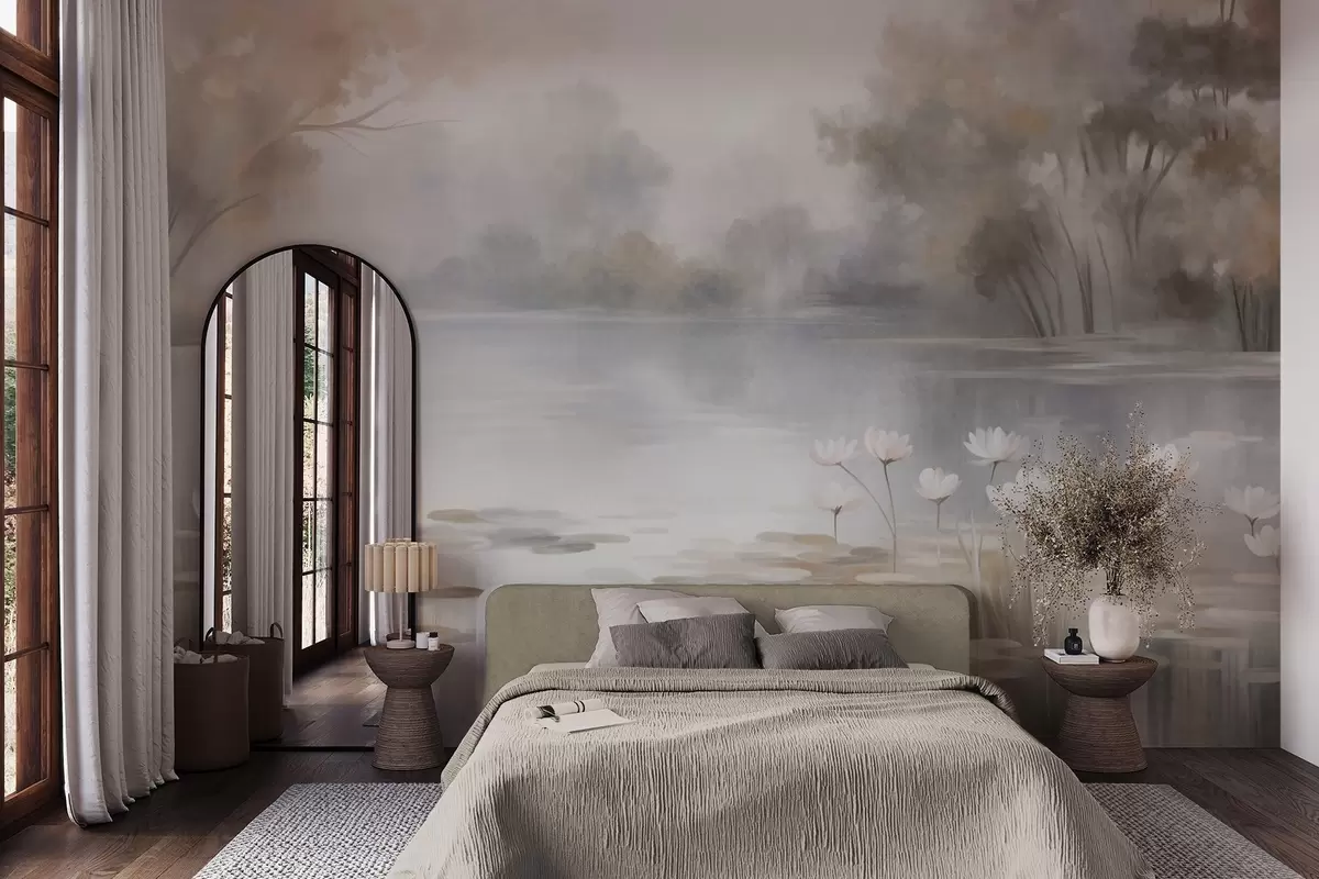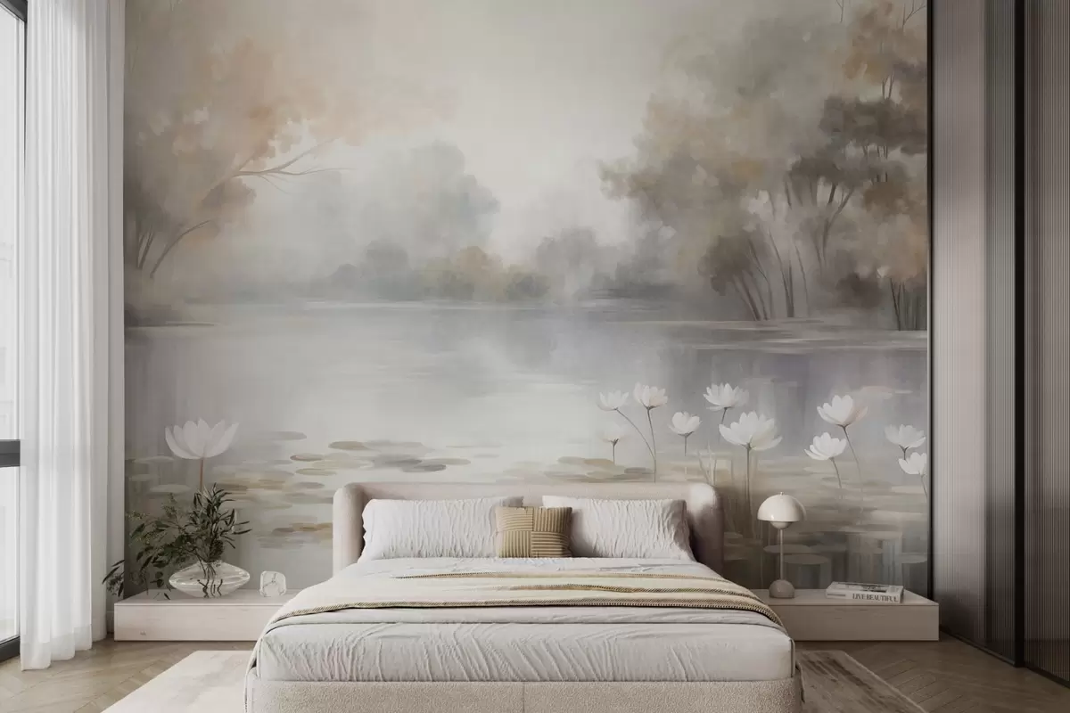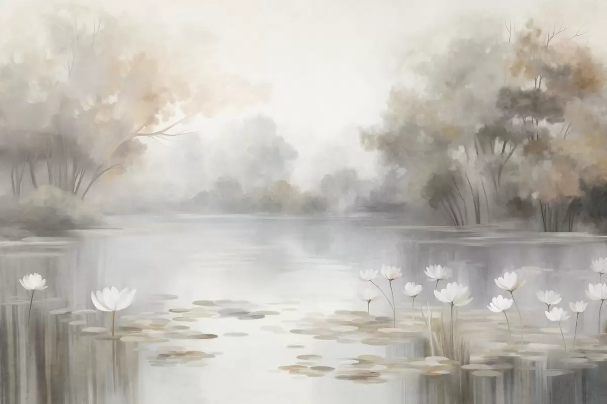 Fotomurales Paisaje con relieve, lago con nenúfares blancos, rodeado de árboles de colores tenues Nr. w09768