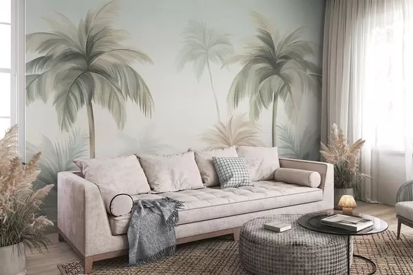 Fotomurales Palmeras con hojas de textura rugosa en tonos verdes apagados y beige, recortadas contra un cielo suave Nr. w09770