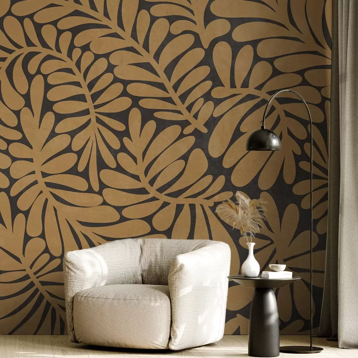 Fotomurales Hojas de color amarillo mostaza estilizadas sobre un fondo gris oscuro, obra de arte con textura Nr. w09775