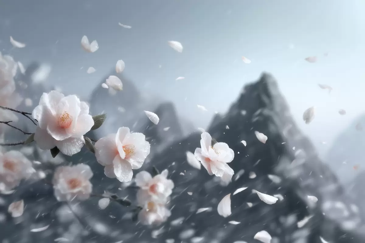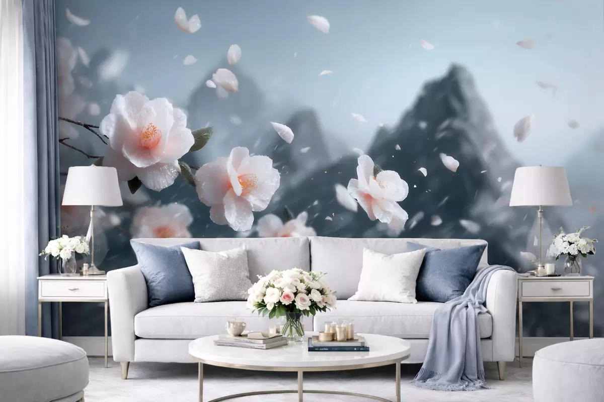 Fotomurales Delicadas flores de cerezo con las montañas de fondo; evocador paisaje japonés en tonos pastel Nr. w09808