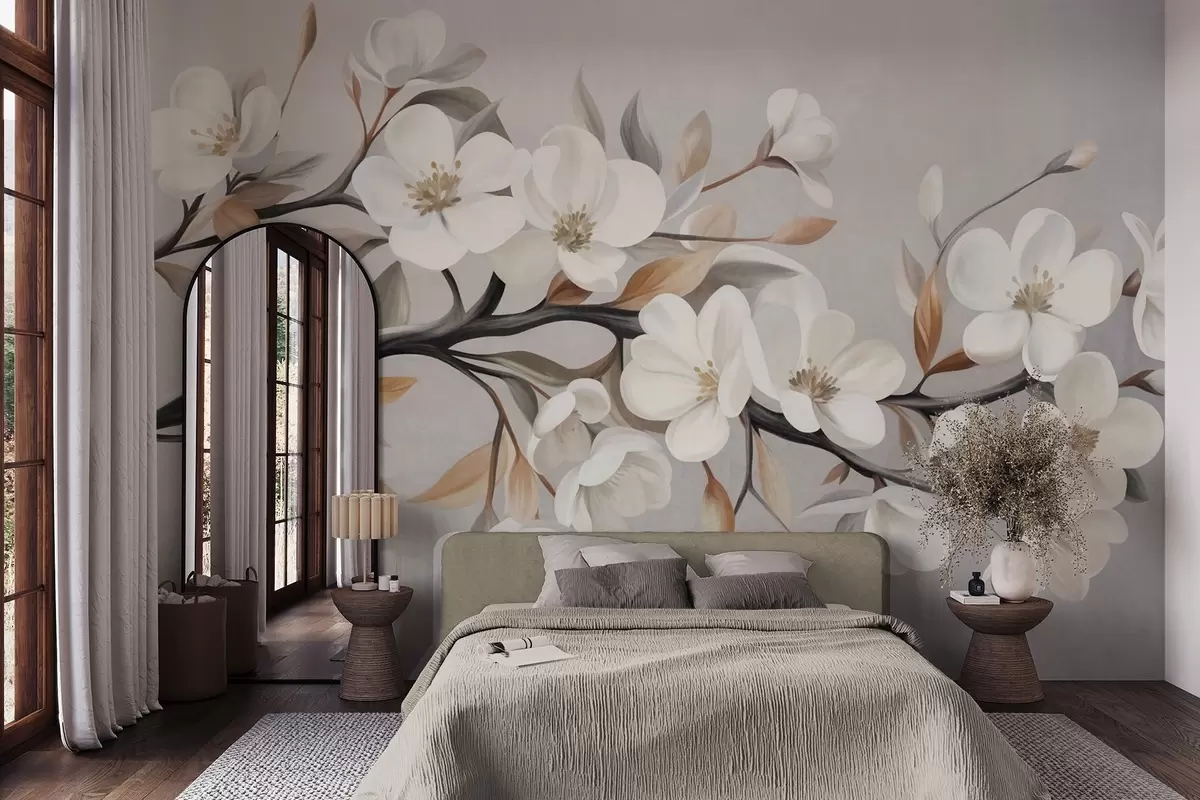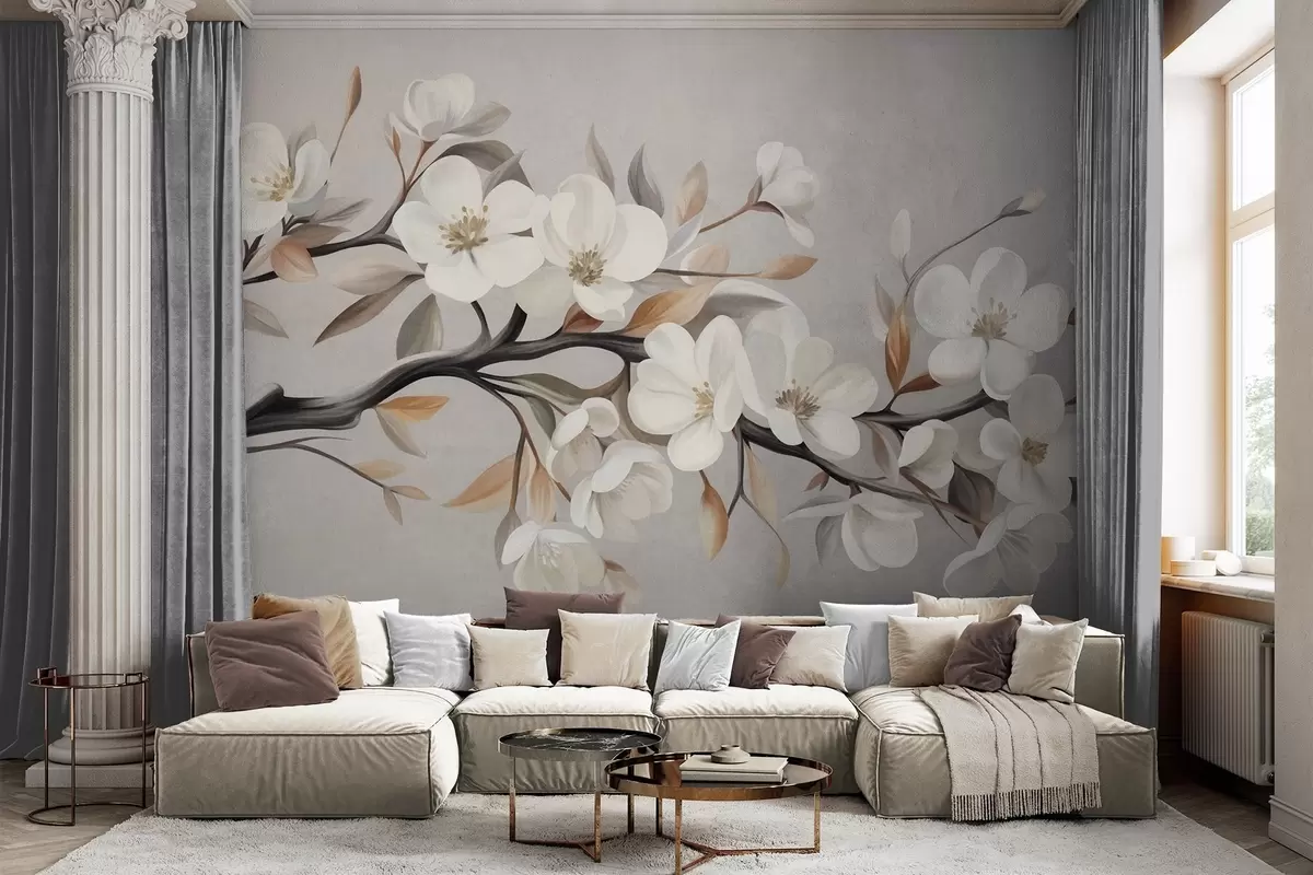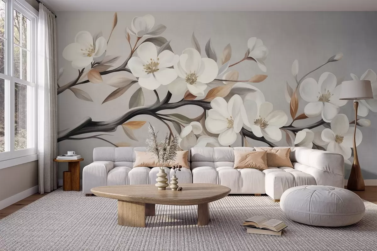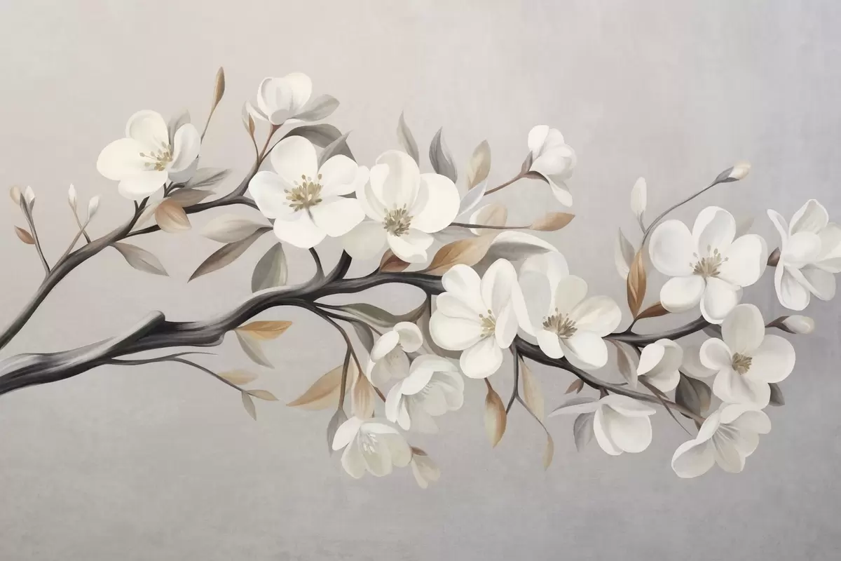 Fotomurales Rama con textura, con flores blancas y hojas marrones sobre un fondo gris claro Nr. w09817