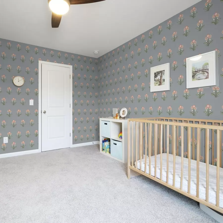 Flores estilizadas sobre fondo gris azulado, paleta cálida