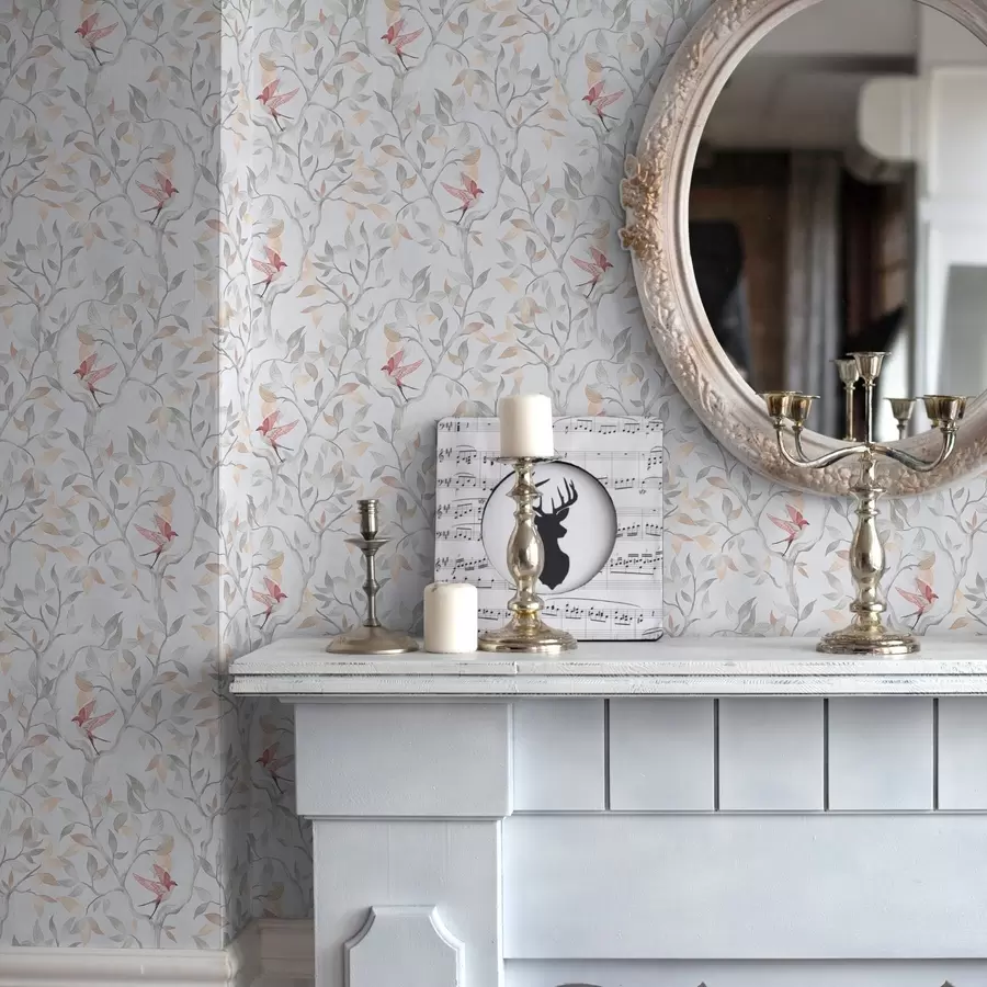 Ramas ligeras con hojas y pájaros en tonos melocotón