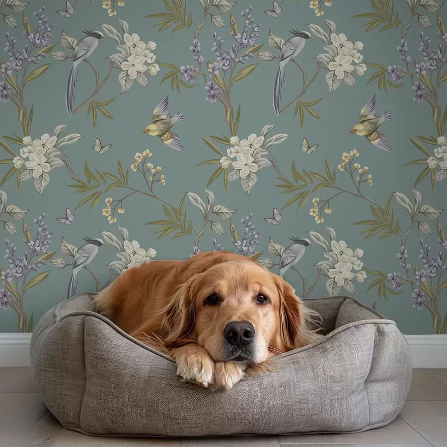 Pájaros, flores y mariposas sobre un fondo azul grisáceo.