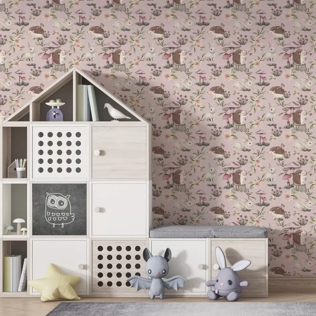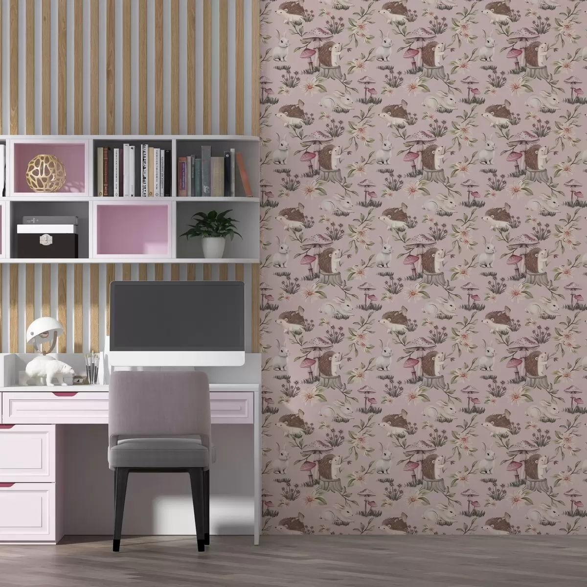 Papel tapiz Erizos, conejos y flores de cuento de hadas entre setas sobre fondo rosa Nr. a00111