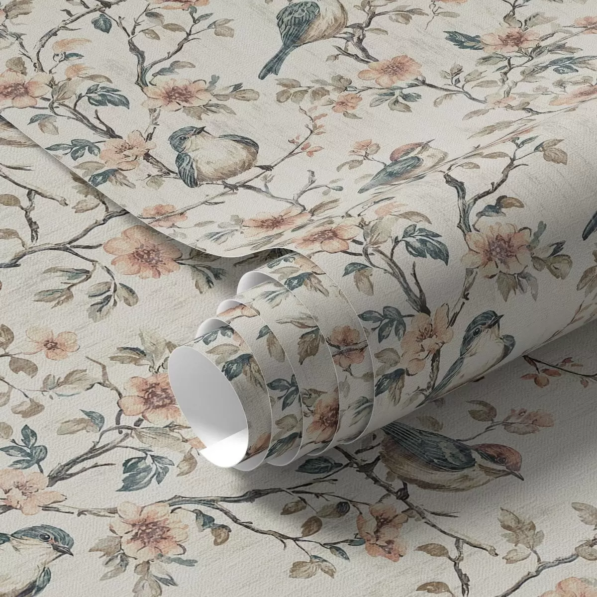 Papel tapiz Pájaros sobre ramas con flores en estilo acuarela retro Nr. a00197