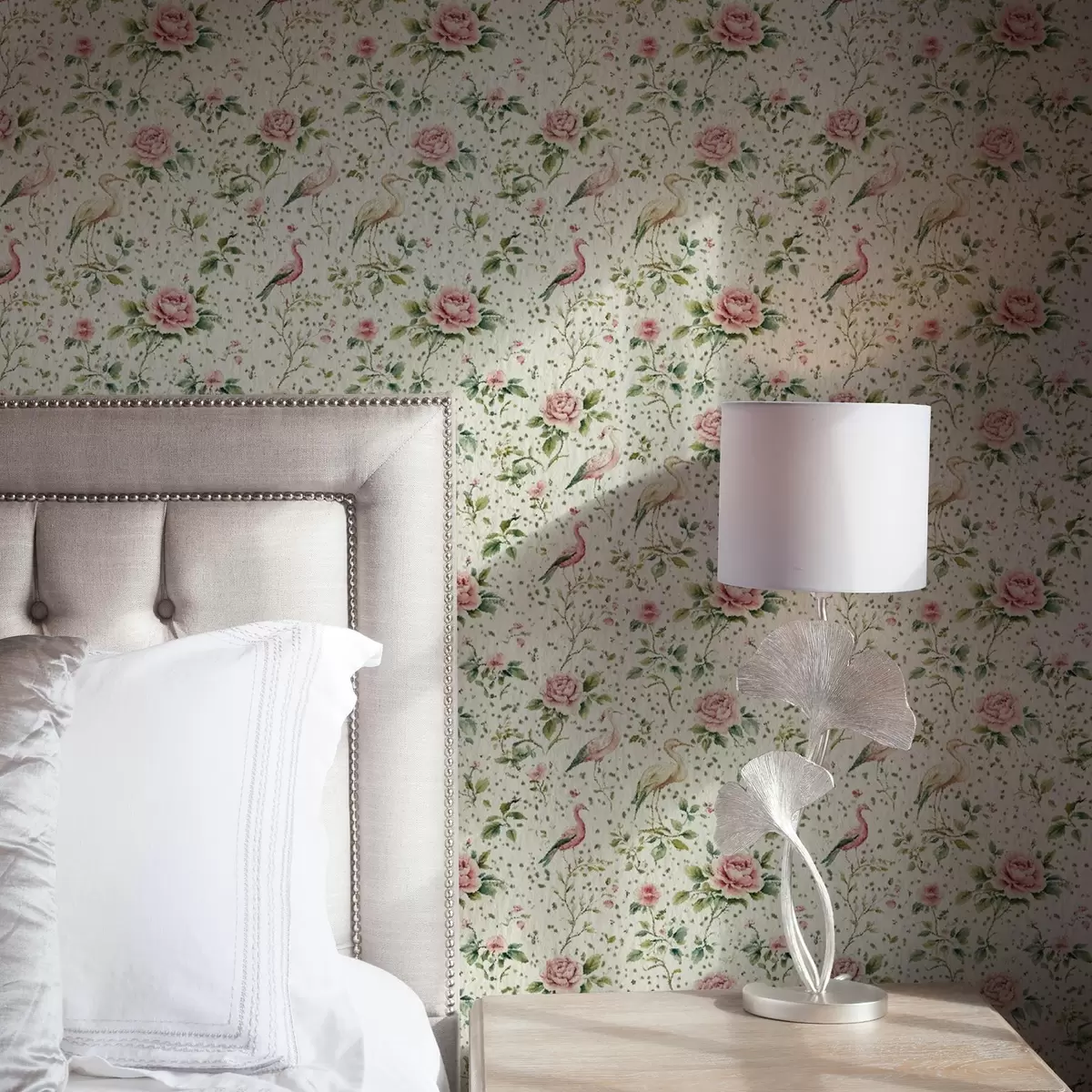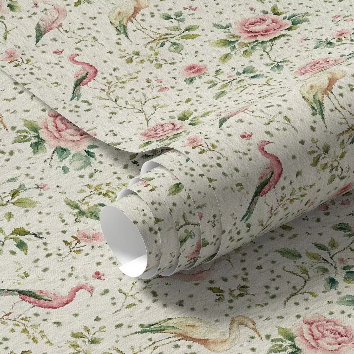 Papel tapiz Rosas rosa pastel y pájaros en estilo shabby chic Nr. a00201