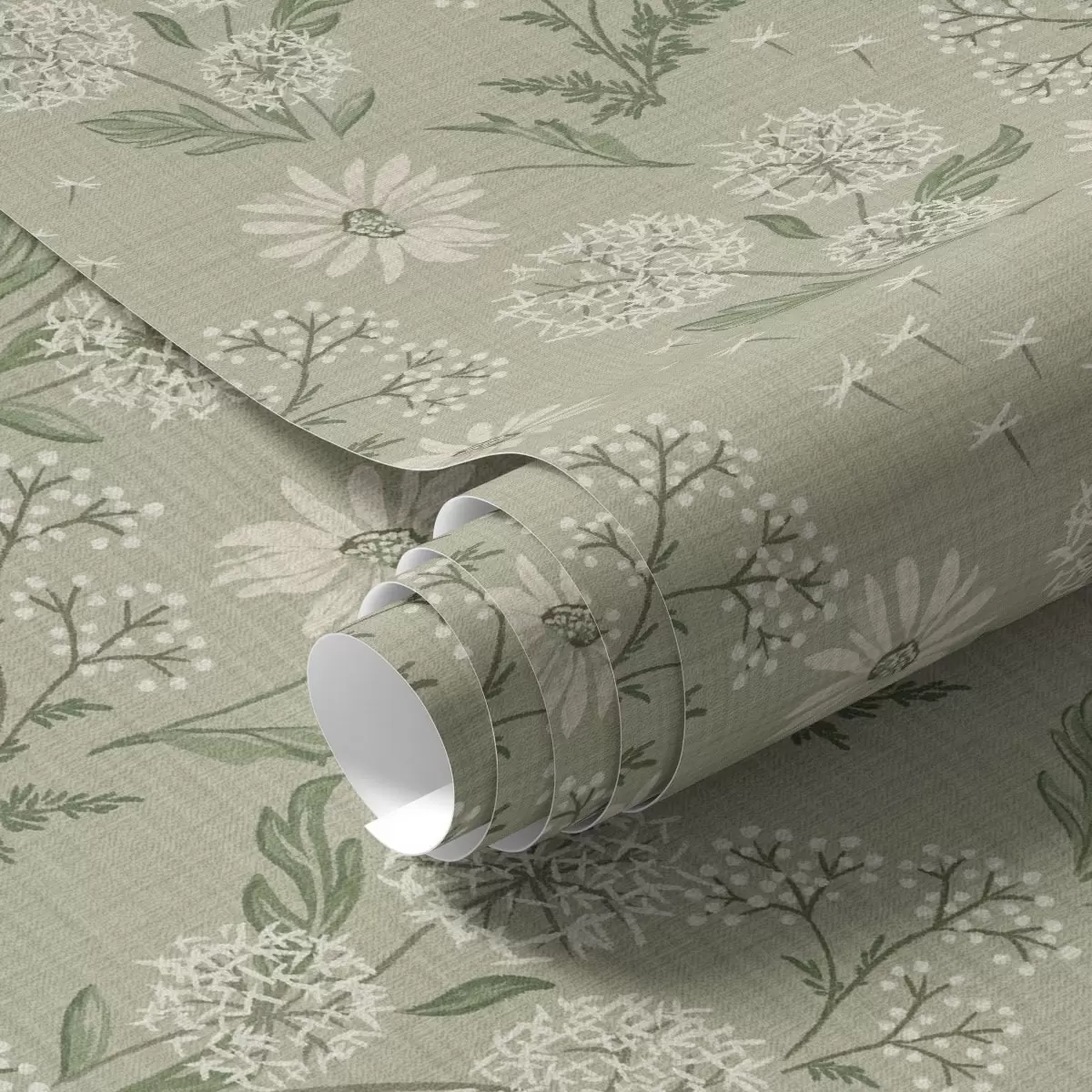 Papel tapiz Dientes de león y margaritas, motivo botánico sobre fondo gris verdoso Nr. a00224