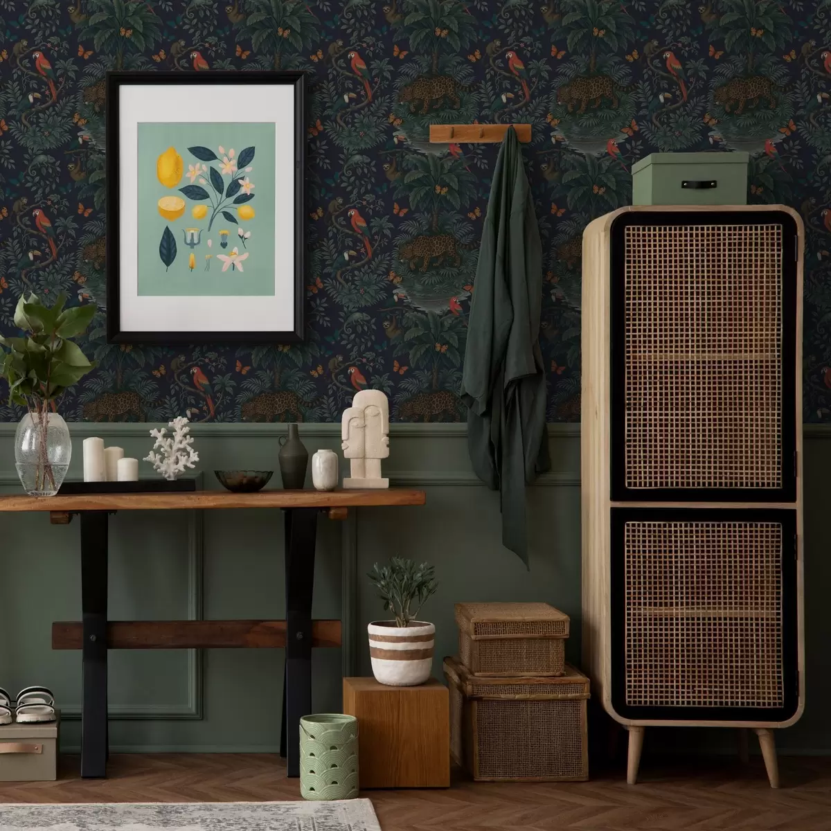 Papel tapiz Selva tropical con leopardo, leopardo, loros y mariposas Nr. a00388