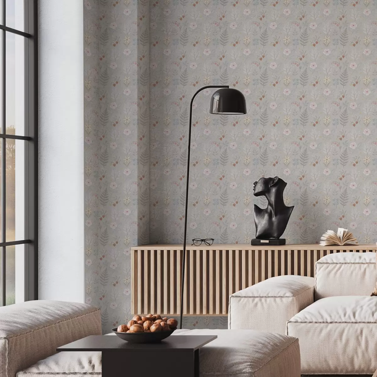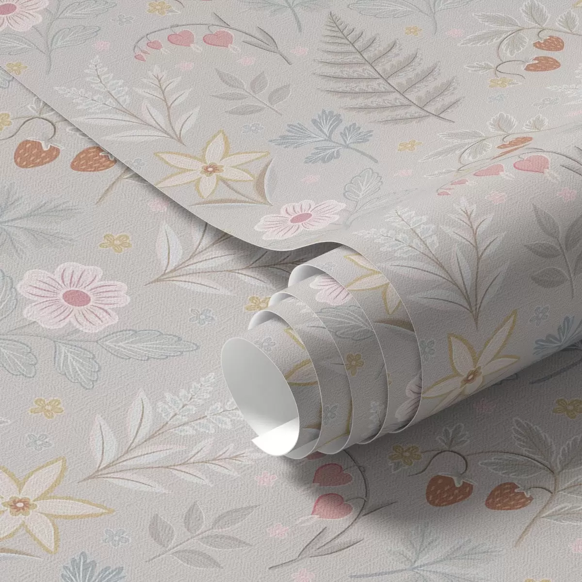 Papel tapiz Flores y bayas pastel sobre fondo gris claro Nr. a00406