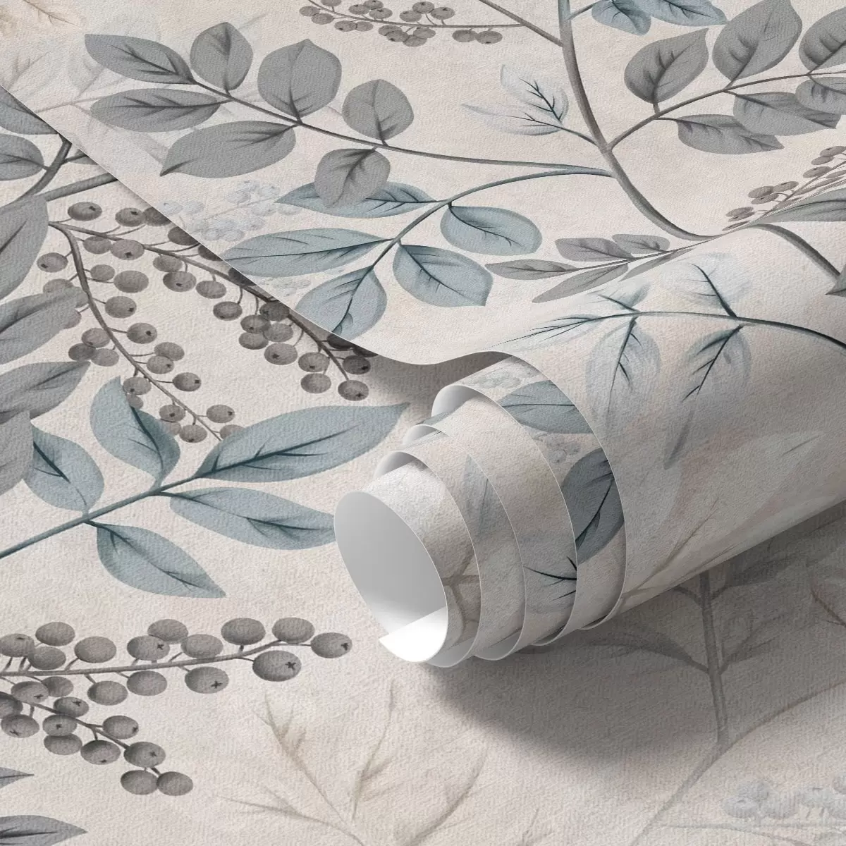 Papel tapiz Ramas de bayas en tonos pastel con hojas azul grisáceo Nr. a00443