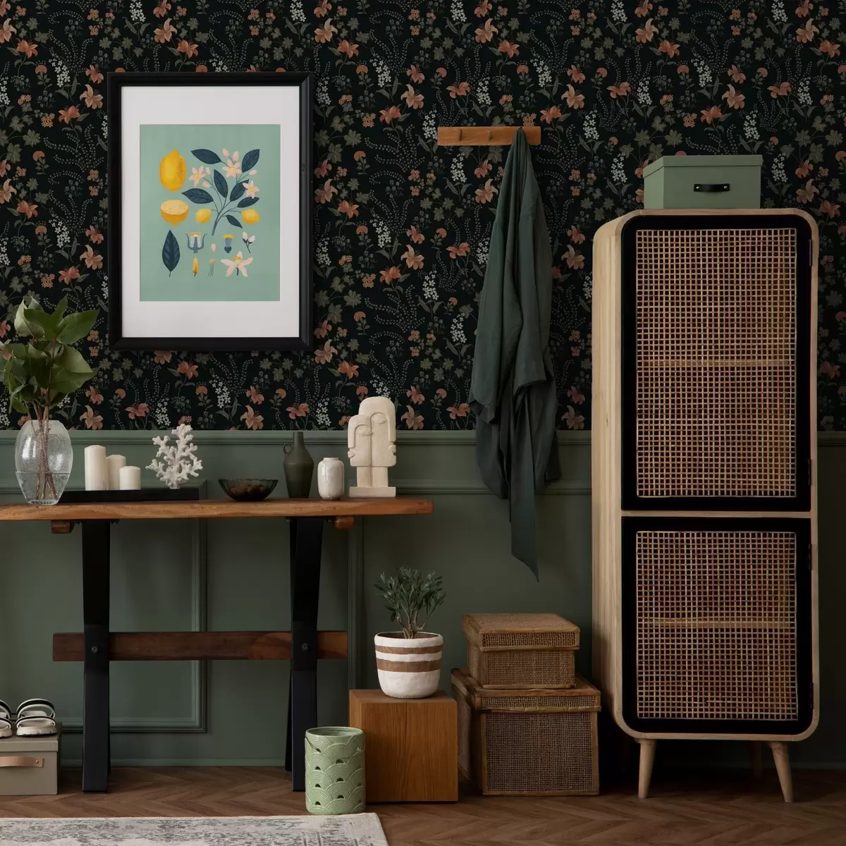 Papel tapiz Lirios naranjas y pequeñas flores sobre fondo negro Nr. a00463
