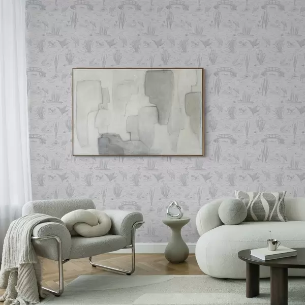 Papel tapiz Dibujo de garzas y plantas acuáticas en tonos grises tranquilos Nr. a00479