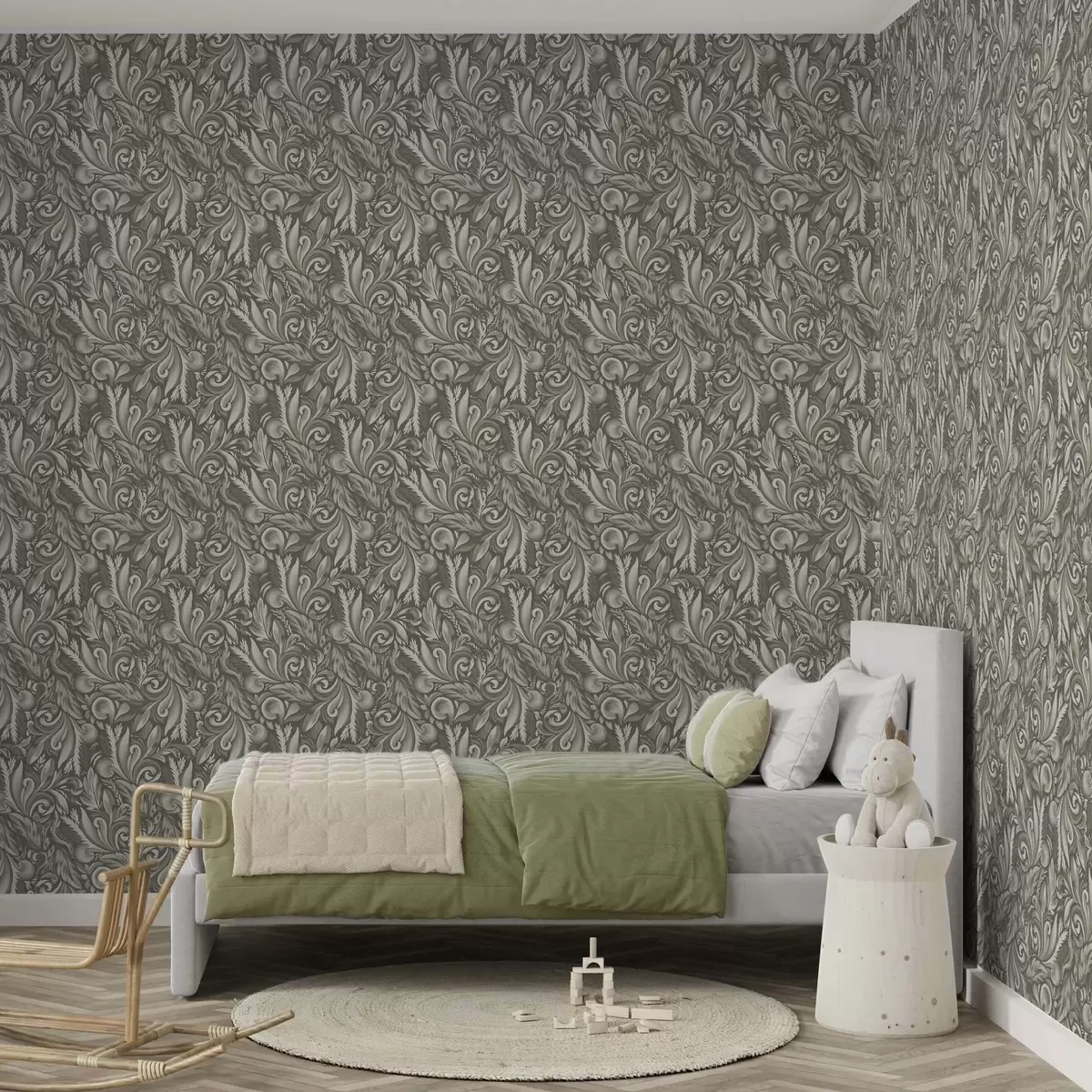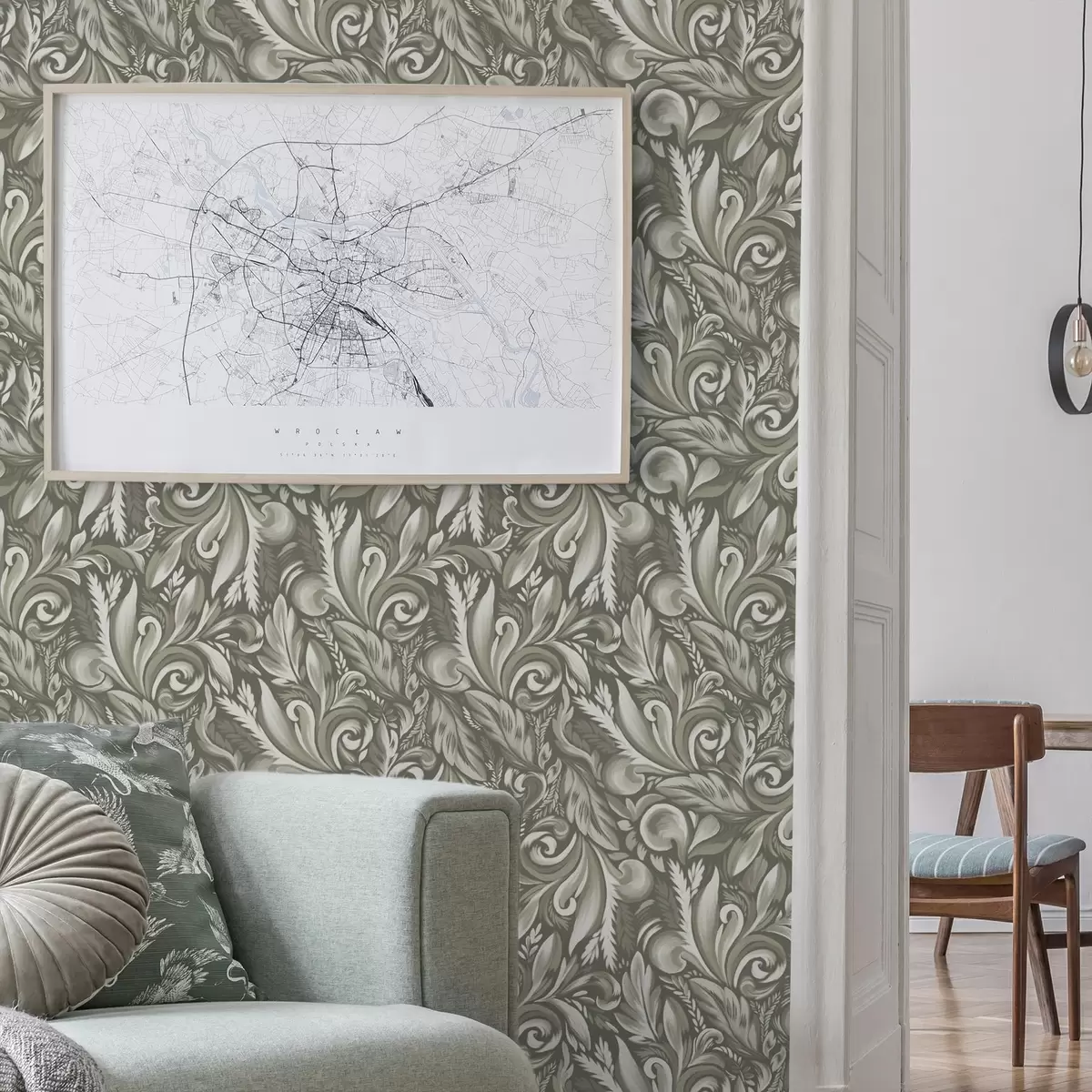 Papel tapiz Volutas de acanto en una paleta de colores beige oliva Nr. a00501