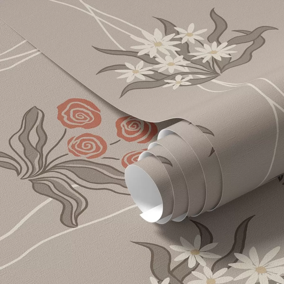 Papel tapiz Flores retro con líneas onduladas sobre un fondo beige cálido Nr. a00503