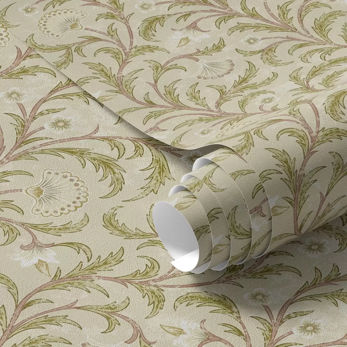 Papel tapiz Adorno vintage con volutas y flores, beige y oliva Nr. a00574