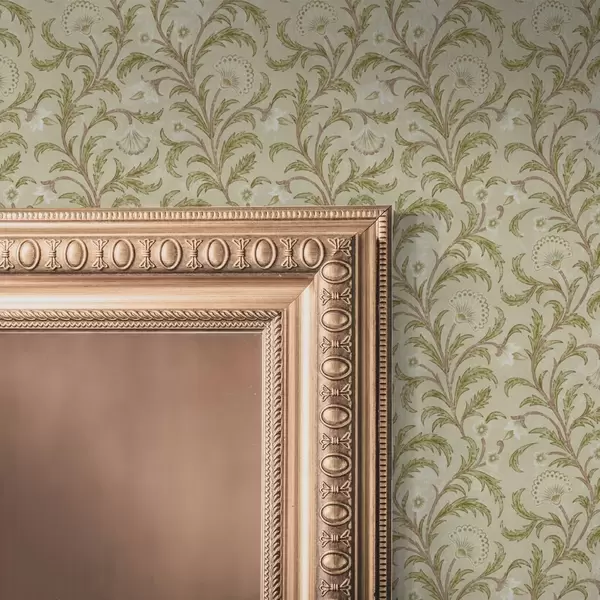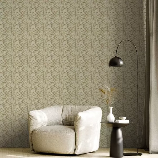 Papel tapiz Adorno vintage con volutas y flores, beige y oliva Nr. a00574
