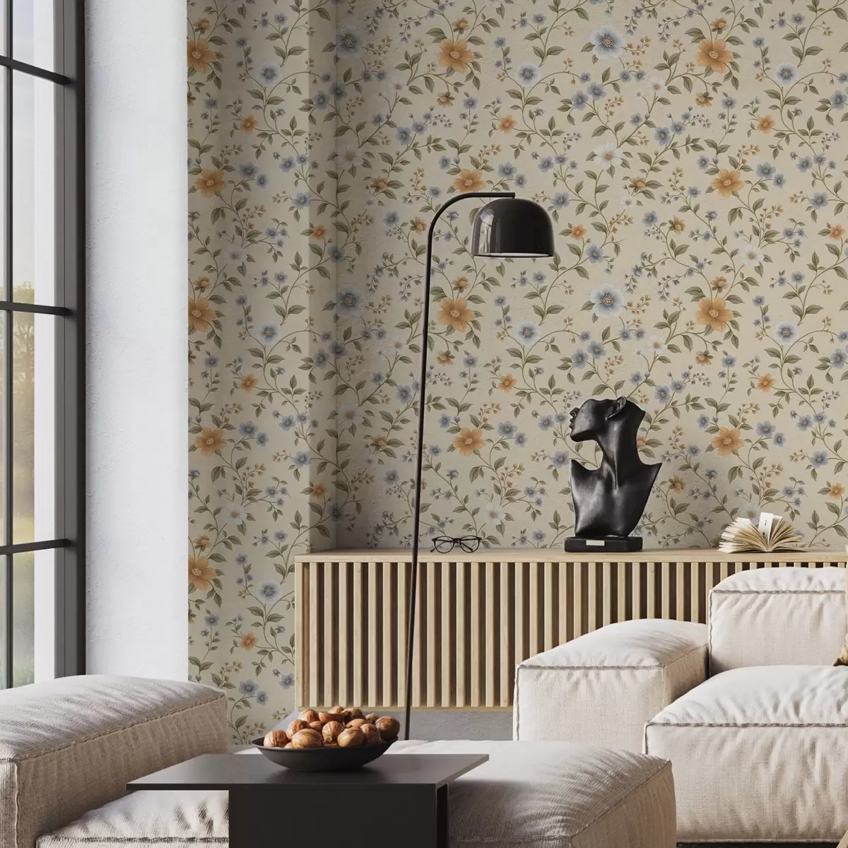 Papel tapiz Ramas florales con flores azules y melocotón Nr. a00575