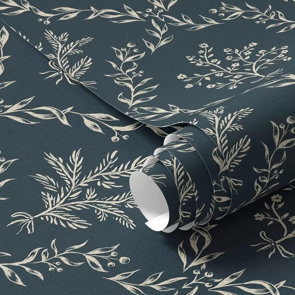 Papel tapiz Coronas blancas de hierbas y flores sobre fondo verde azulado oscuro Nr. a00599v2