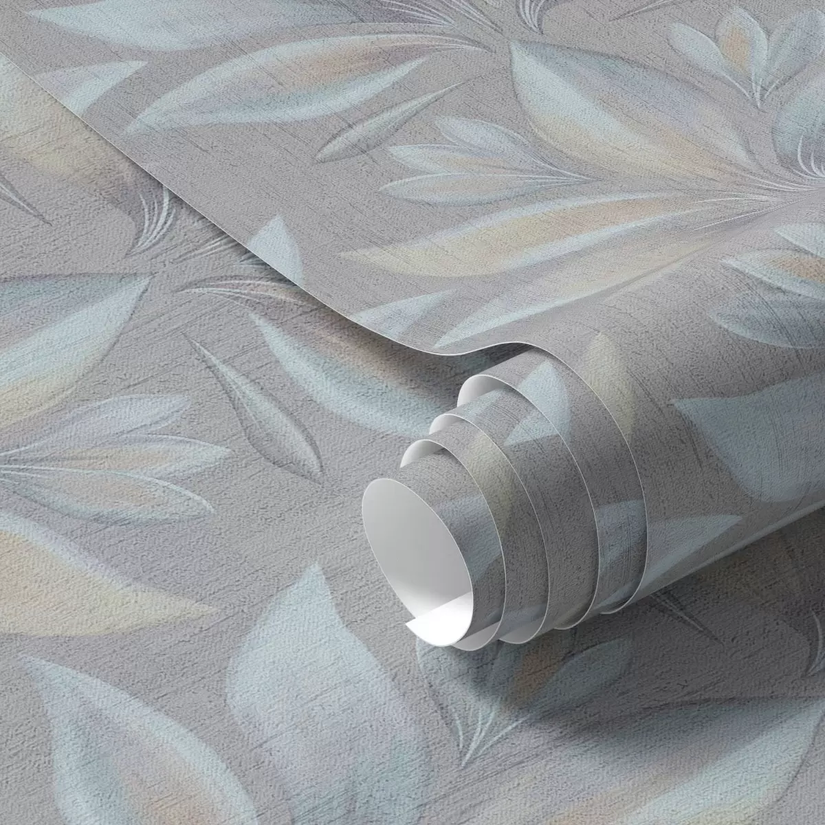 Papel tapiz Grandes hojas estilizadas en una paleta de colores azul arena sobre fondo gris Nr. a00601