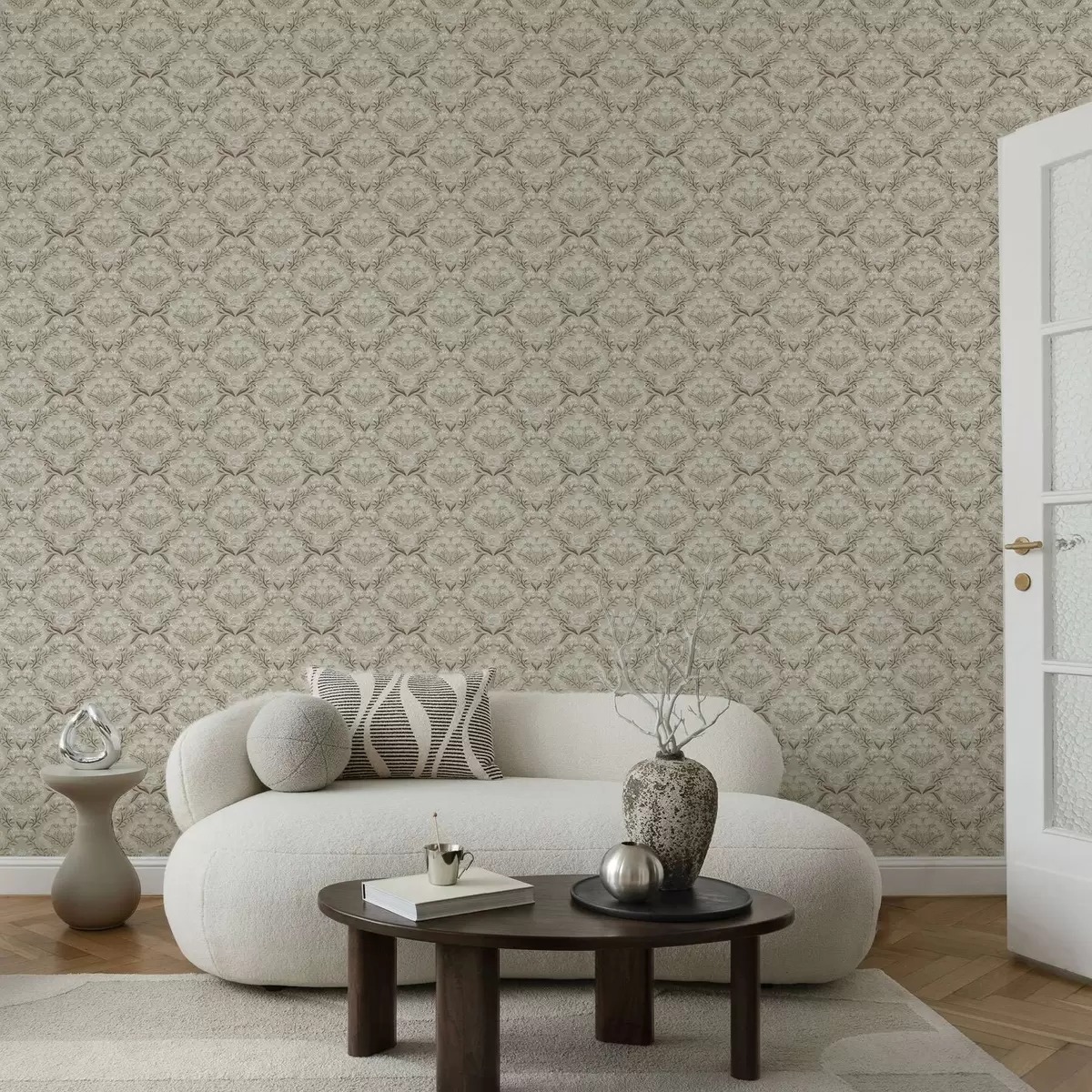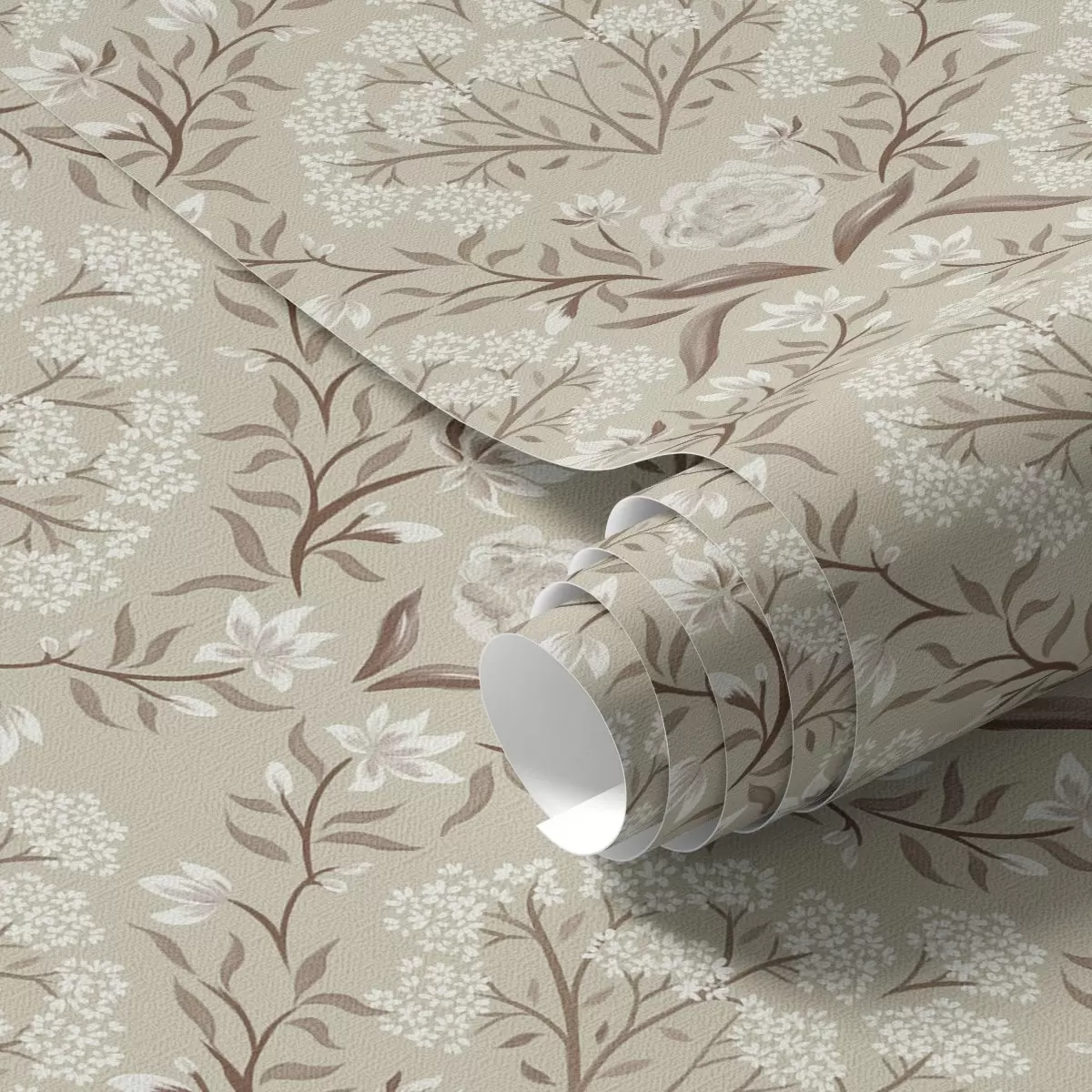 Papel tapiz Damasco beige: peonías, campanillas de invierno y racimos de encaje Nr. a00603v1