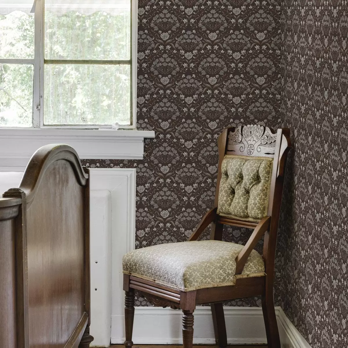 Papel tapiz Damasco de chocolate negro con peonías y campanillas de invierno Nr. a00603v2