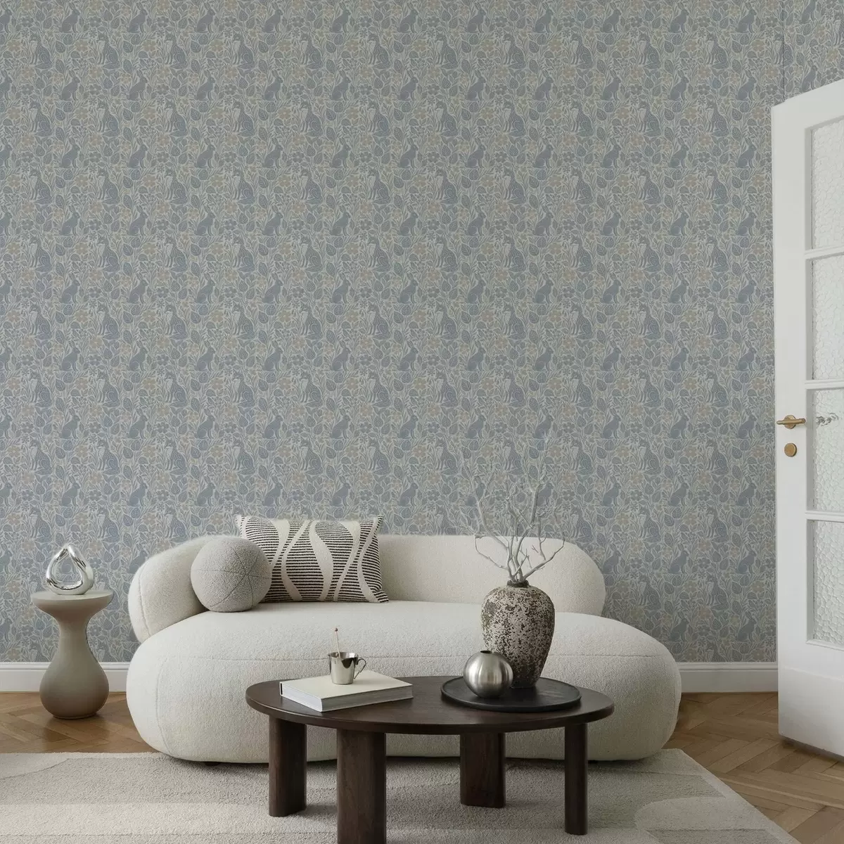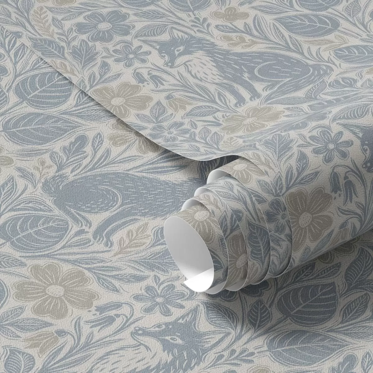 Papel tapiz Animales y flores del bosque: zorro y liebre en tonos azules Nr. a00613