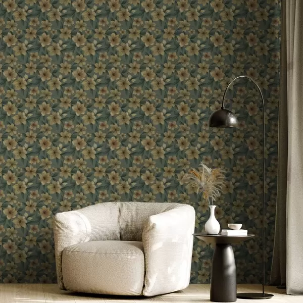 Papel tapiz Flores ocres sobre fondo verde intenso, patrón denso Nr. a00628