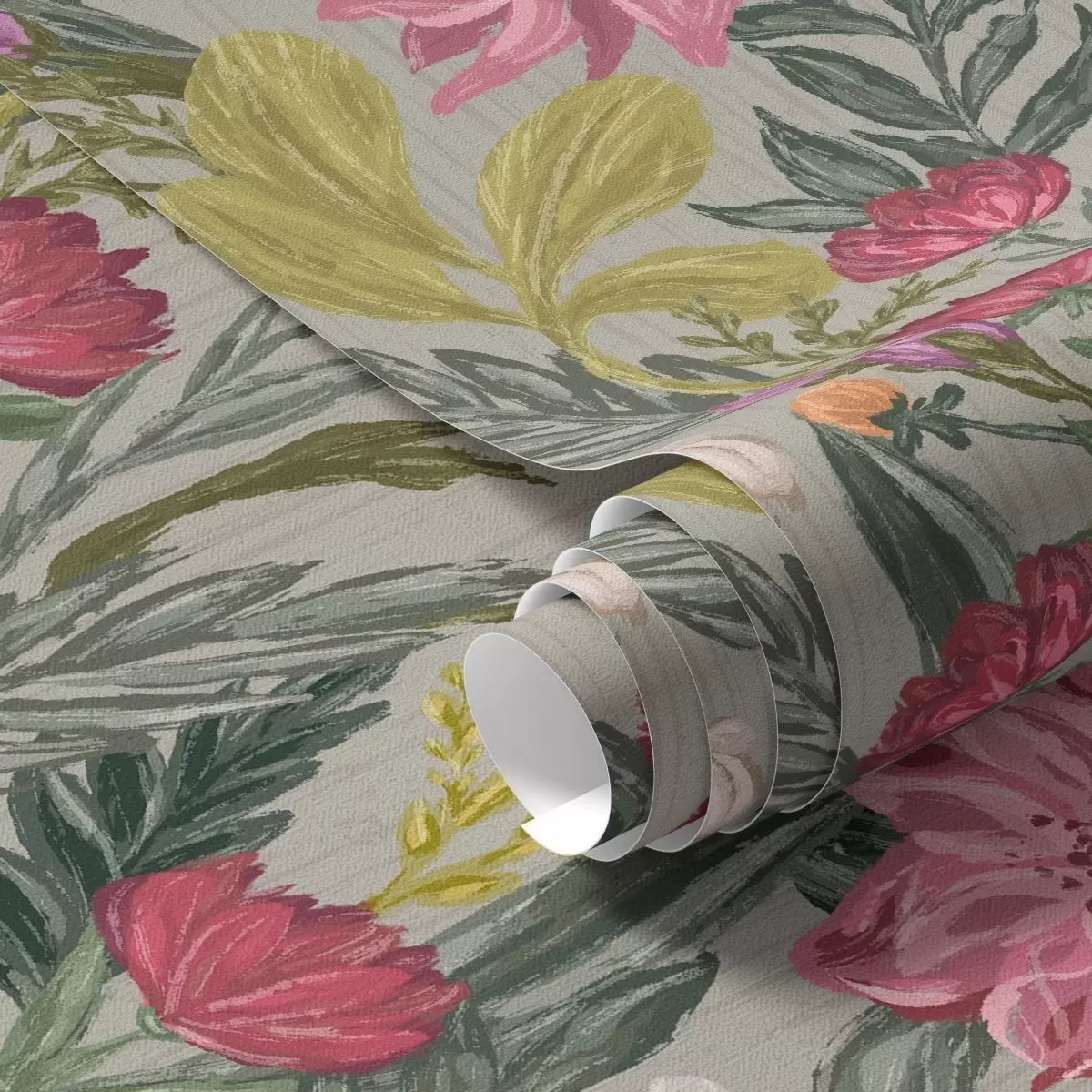 Papel tapiz Exuberantes flores rosas y crema sobre fondo gris, textura impasto Nr. a00629