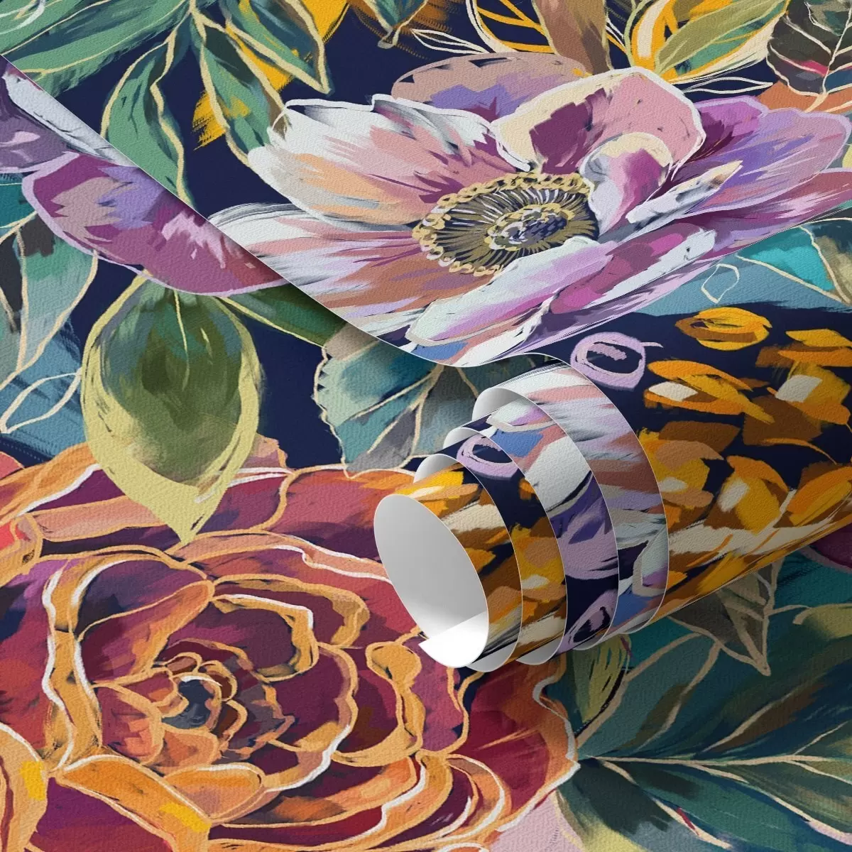 Papel tapiz Flores grandes y llamativas pintadas con pincel sobre un fondo azul oscuro Nr. a00643