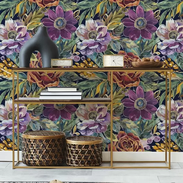 Papel tapiz Flores grandes y llamativas pintadas con pincel sobre un fondo azul oscuro Nr. a00643