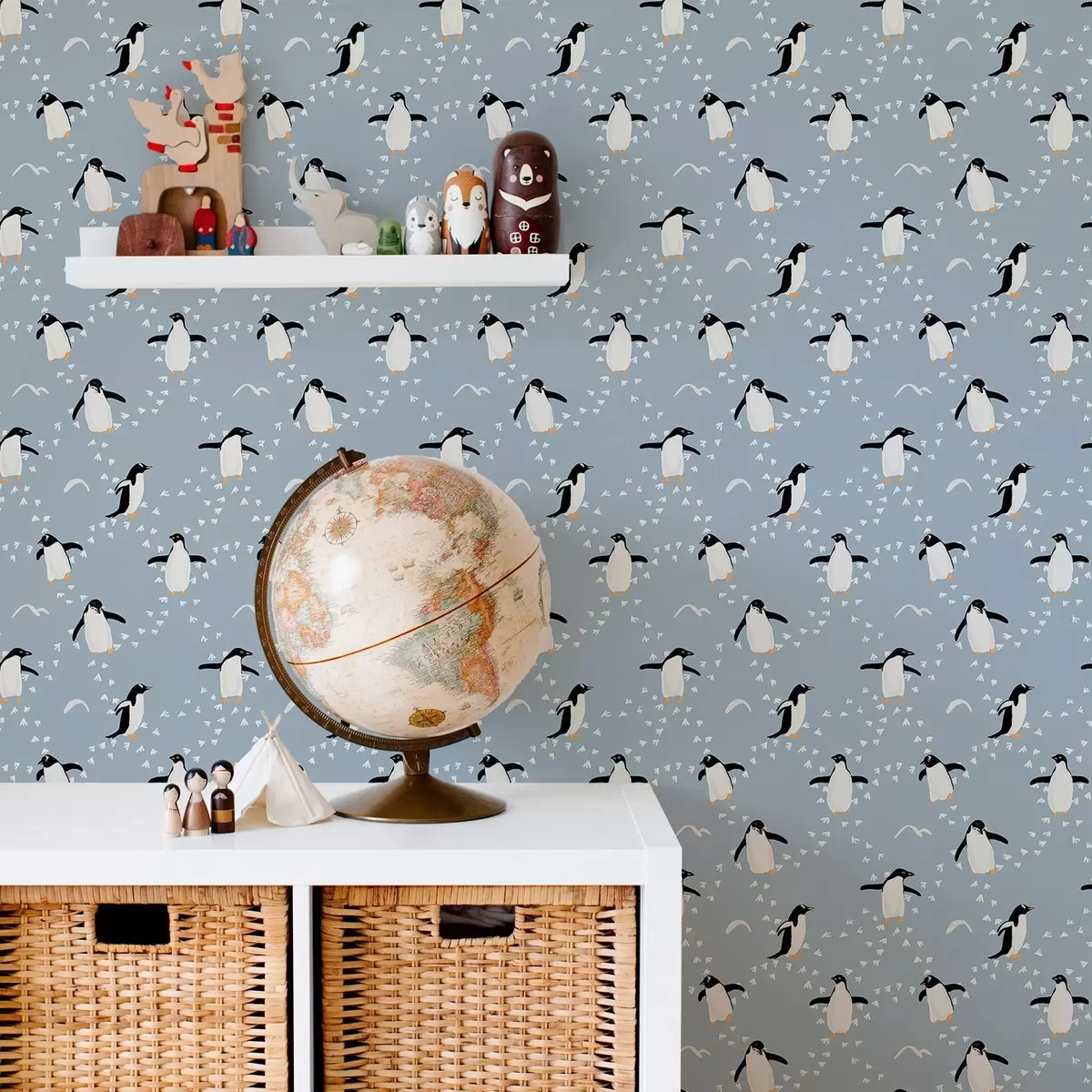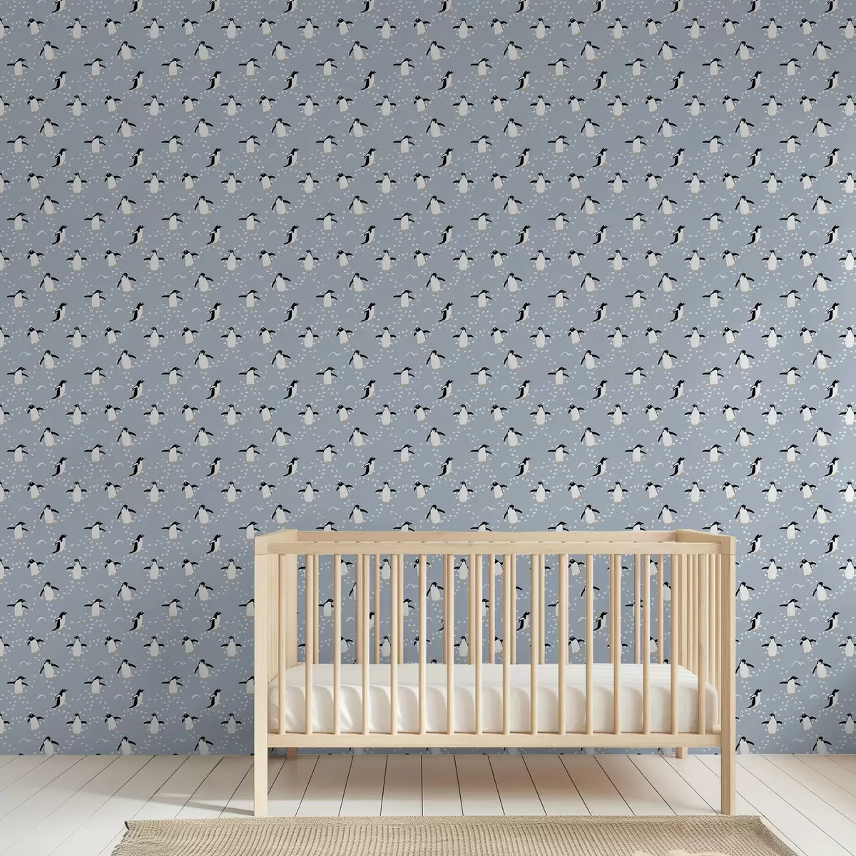 Papel tapiz Pingüinos sobre fondo gris azulado con huellas Nr. a00655